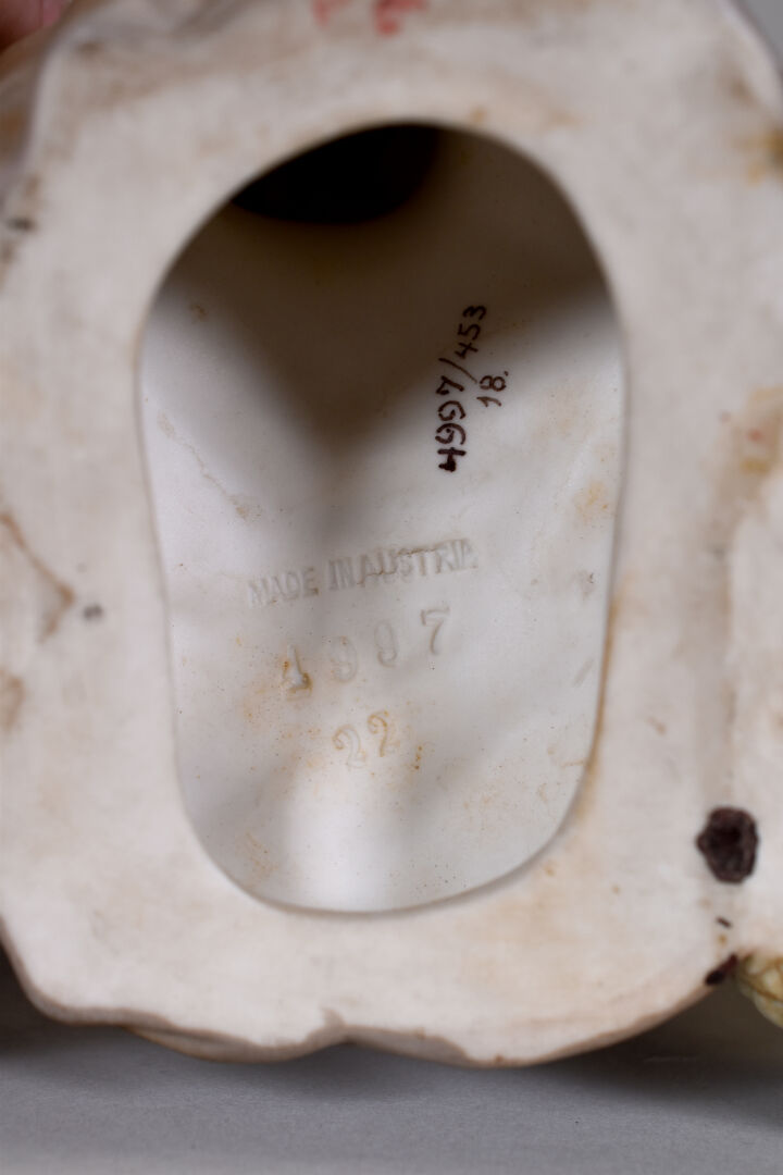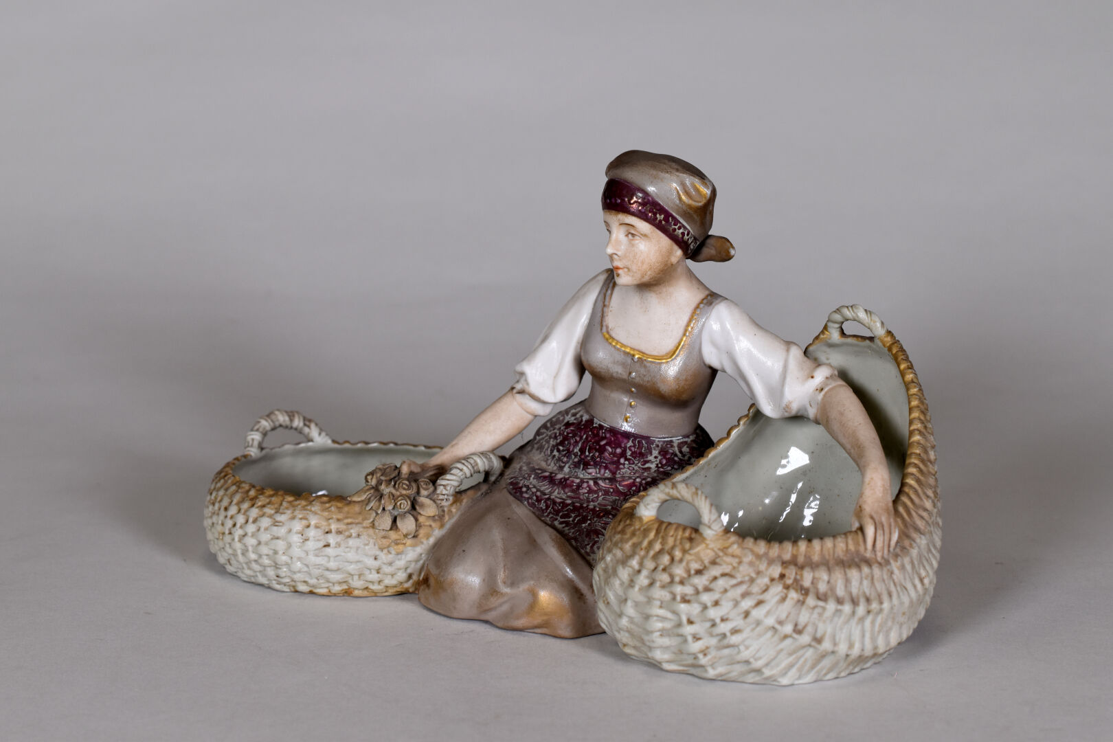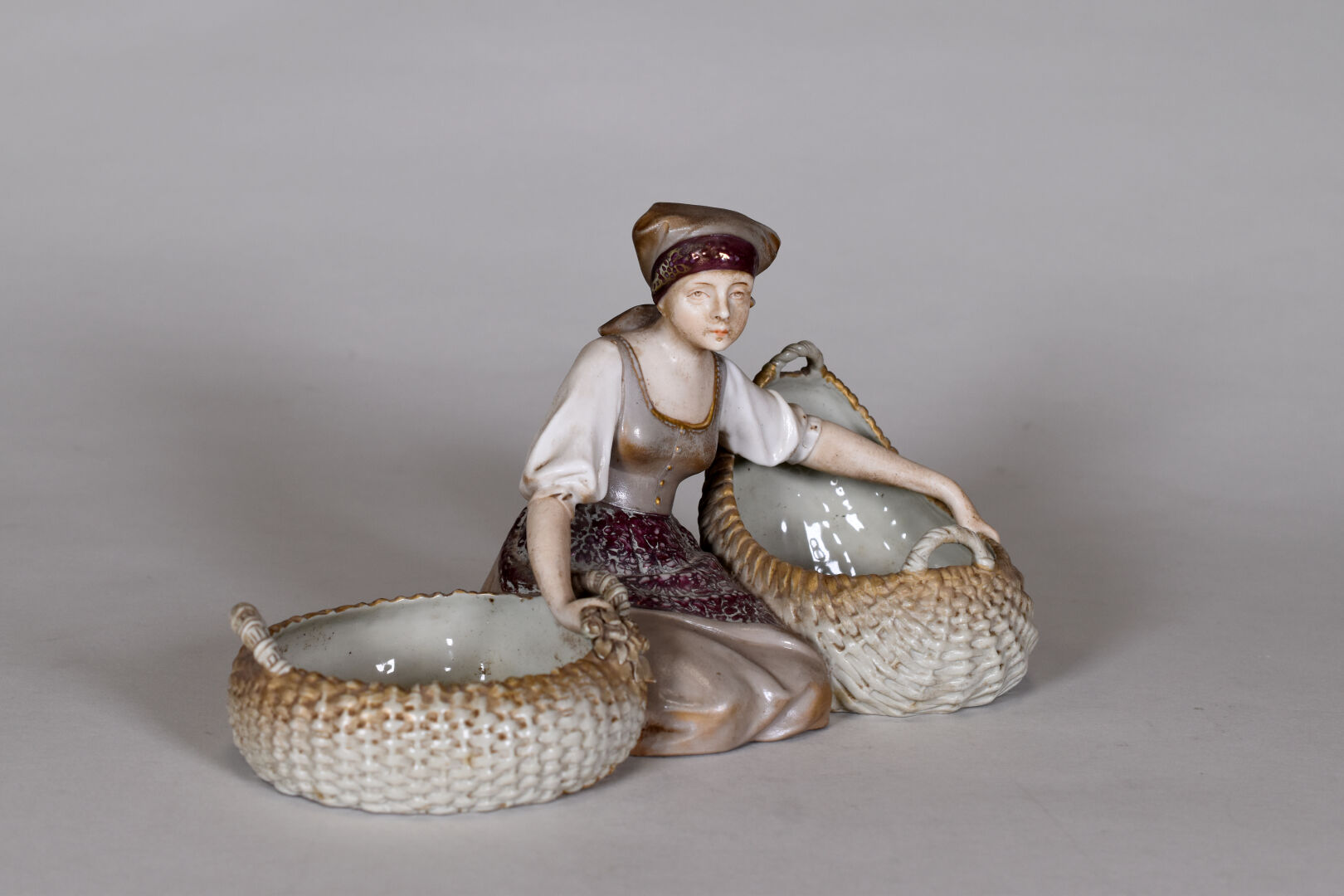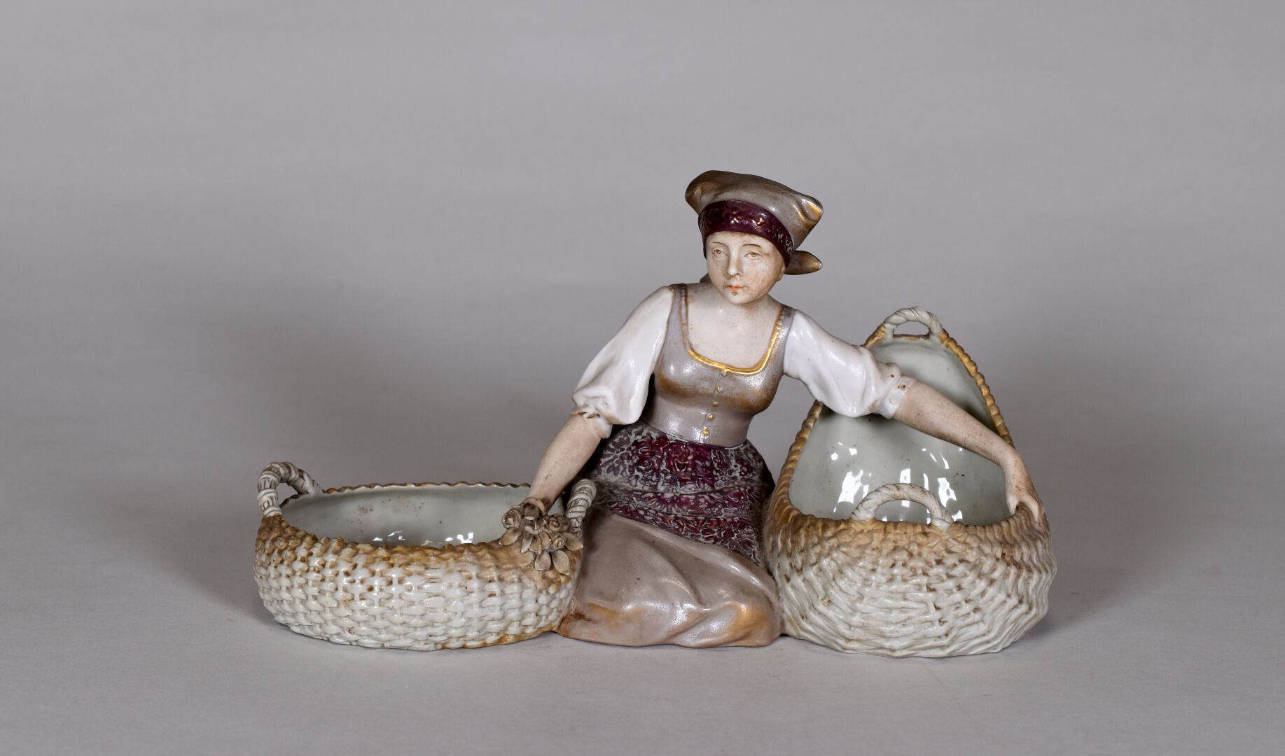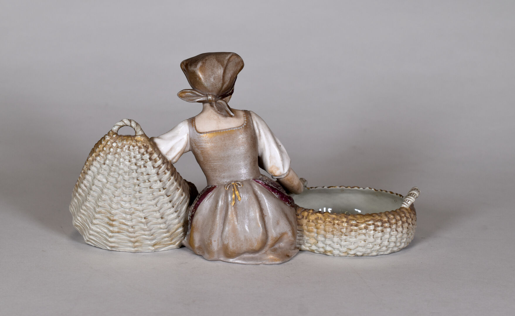 VIENNA – AUSTRIA. Vide poche en porcelaine figurant une femme à genoux tenant deux paniers. Marqué au dessous. Haut. : 17 cm.