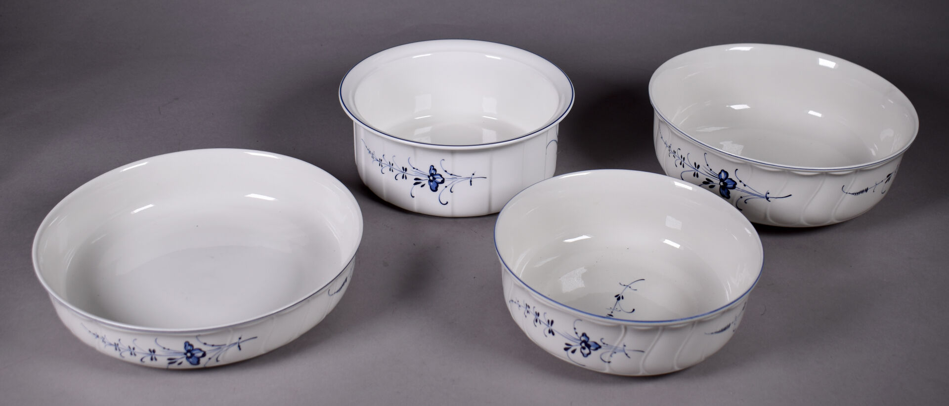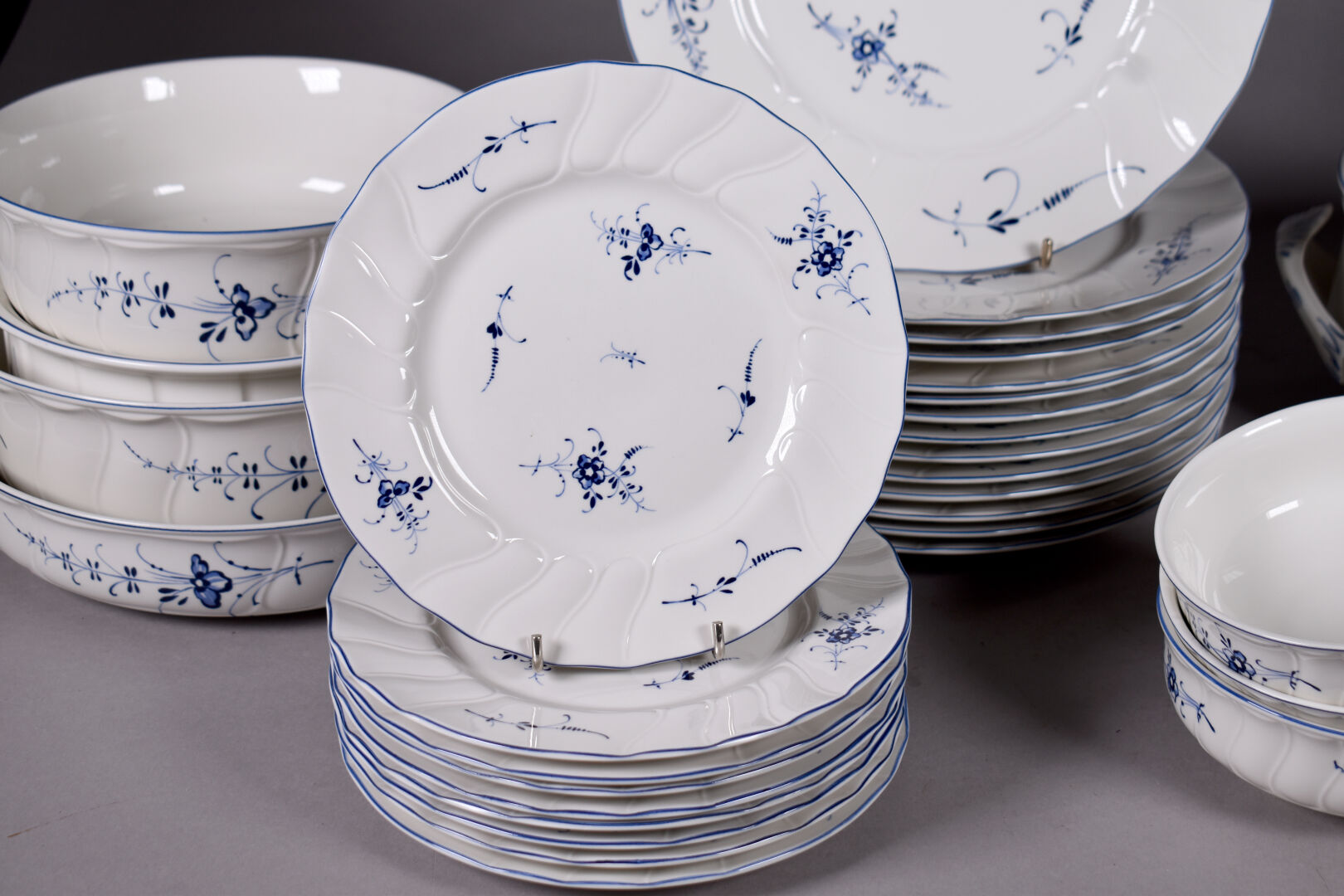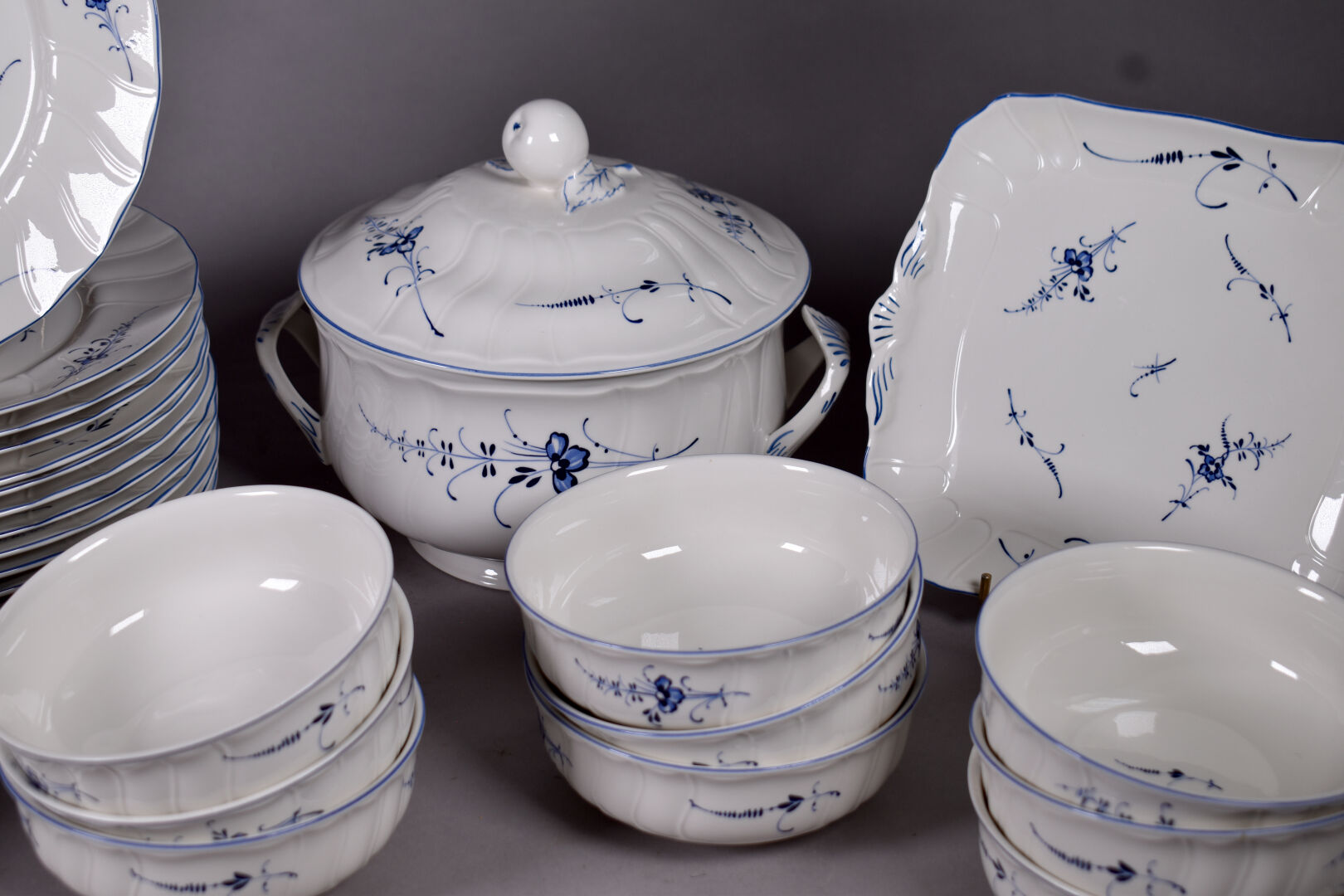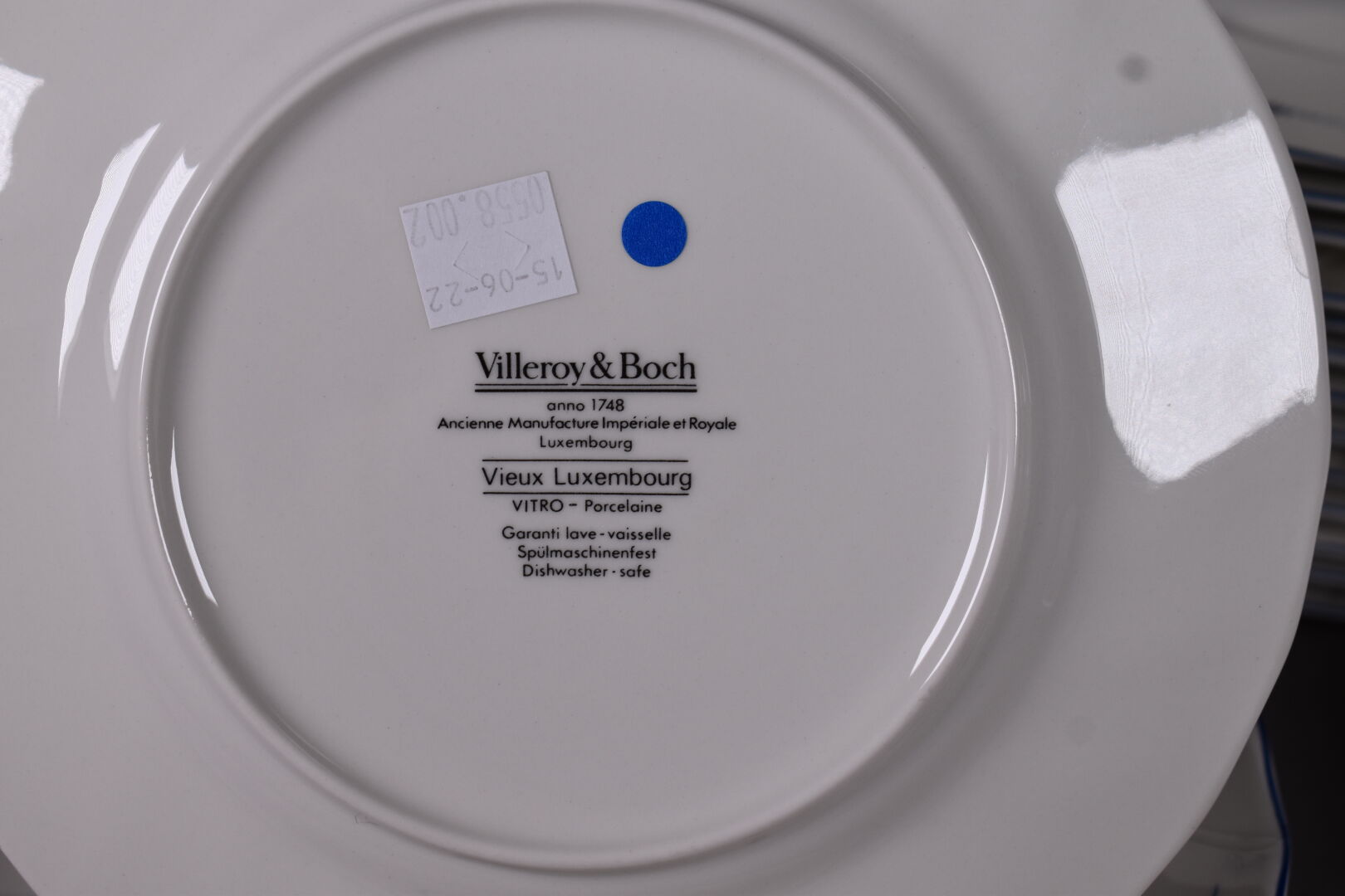 VILLEROY & BOCH. Partie de service de table en porcelaine modèle « Vieux Luxembourg » comprenant 14 assiettes plates, 9 assiettes à dessert, 9 bols à chocolat, 3 saladiers, 1 soupière, 1 jatte, 1 ravier. Marqué.