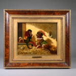 Vincent DE VOS (1829 – 1875). Singe et chien costumés. Huile sur panneau (chêne ? ) signée en bas à gauche. 21,5 x 26,8 cm.