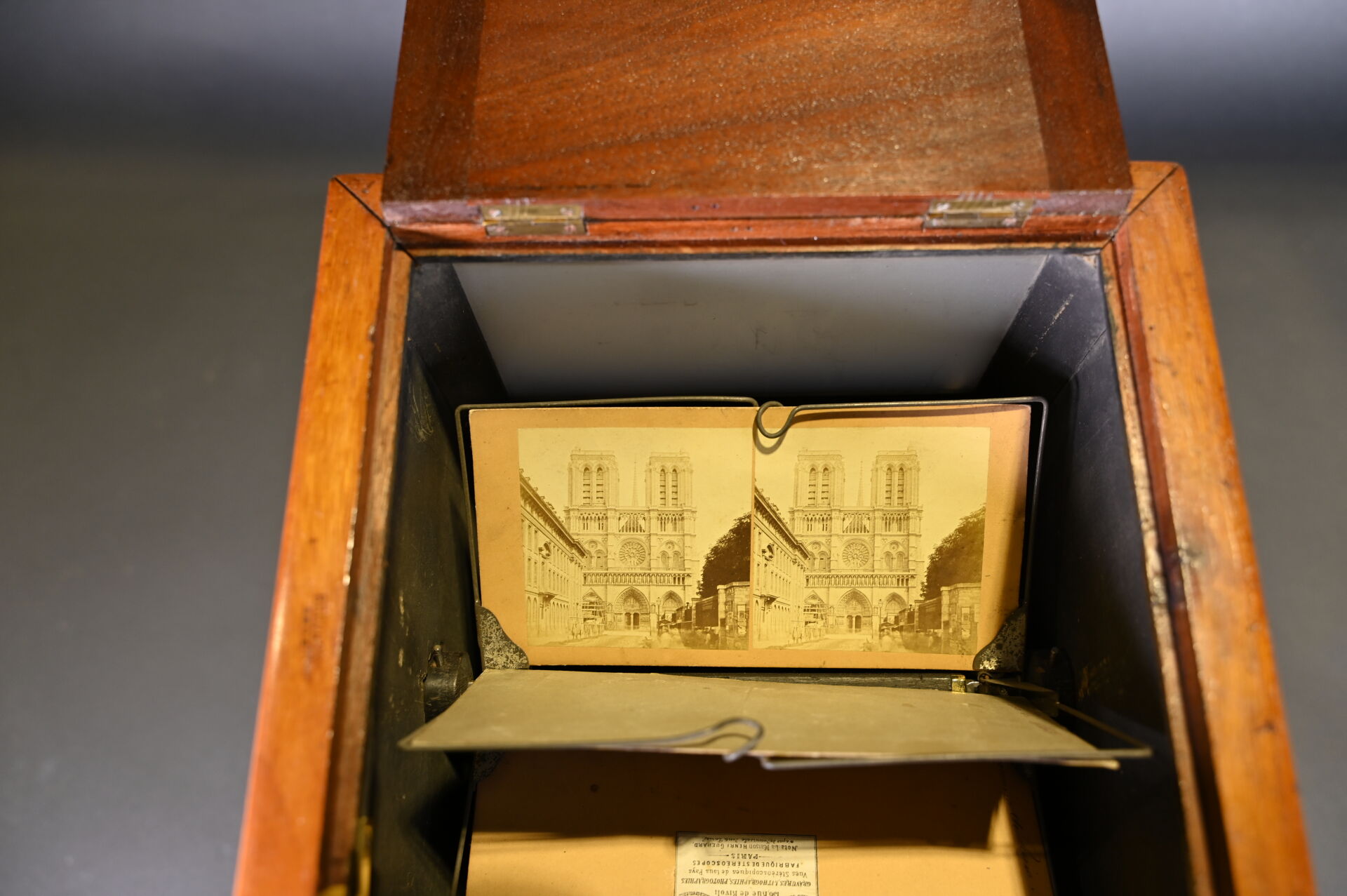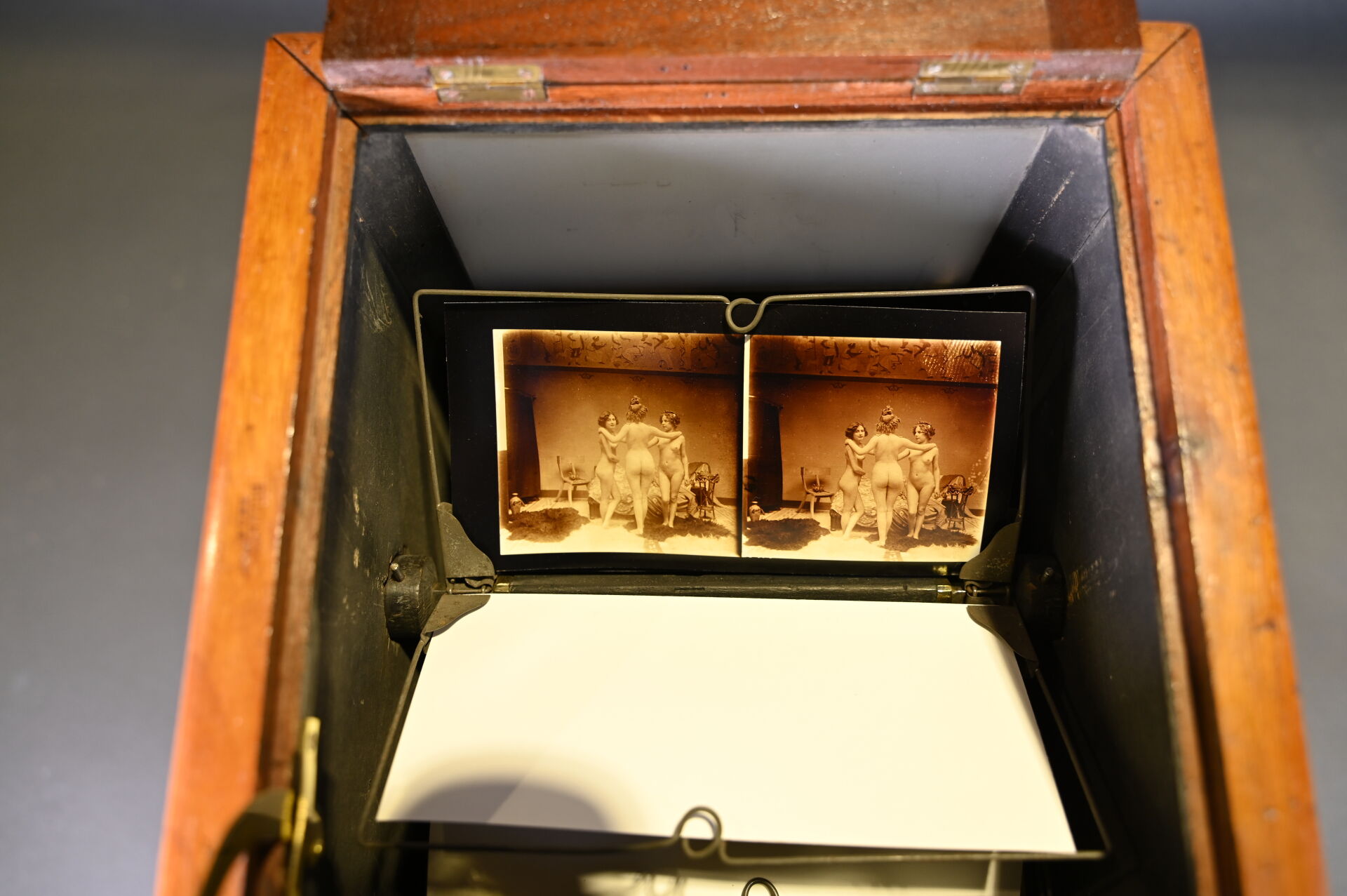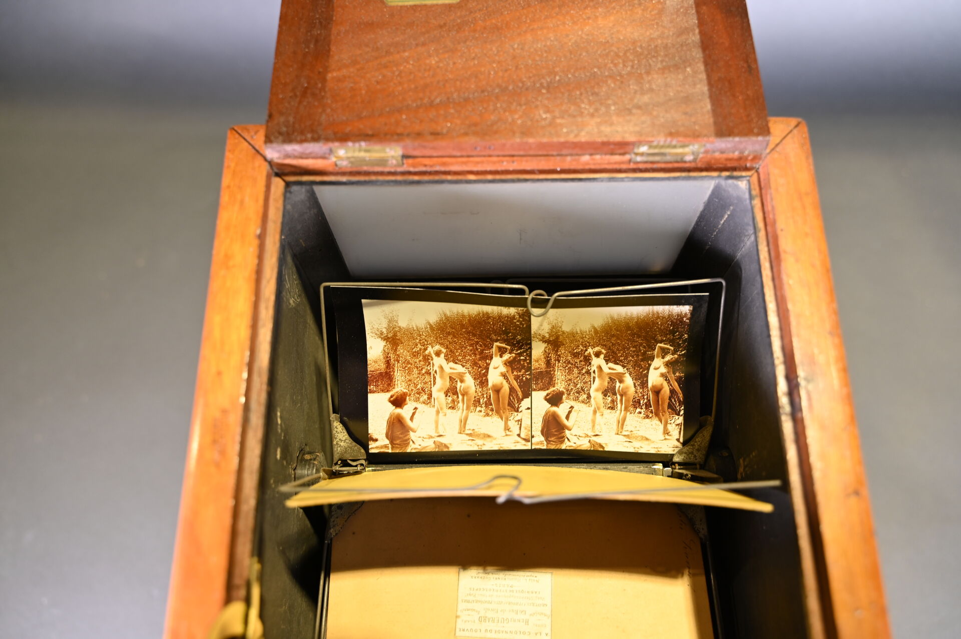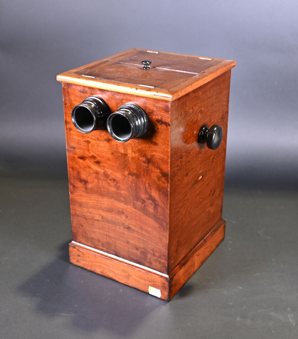 Visionneuse stéréoscopique de plaques en acajou moucheté, avec 45 plaques (Paris, Guerre 14-18, érotisme et divers). Haut. : 41 cm – Larg. : 29 cm – Prof. : 25,5 cm.