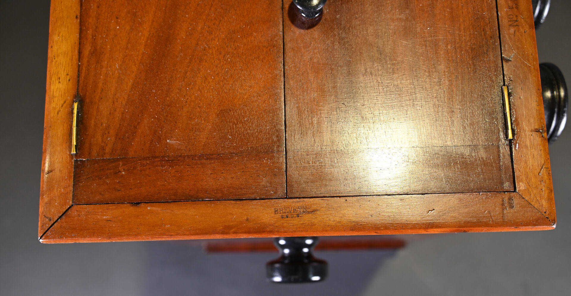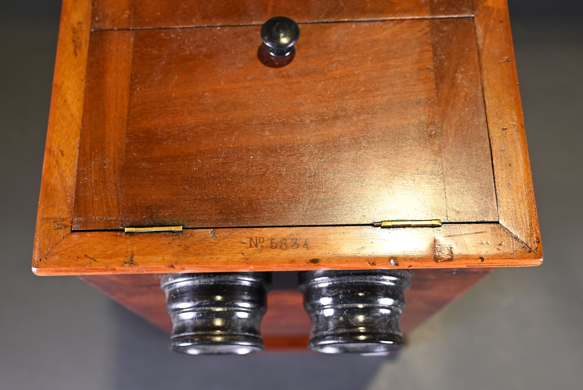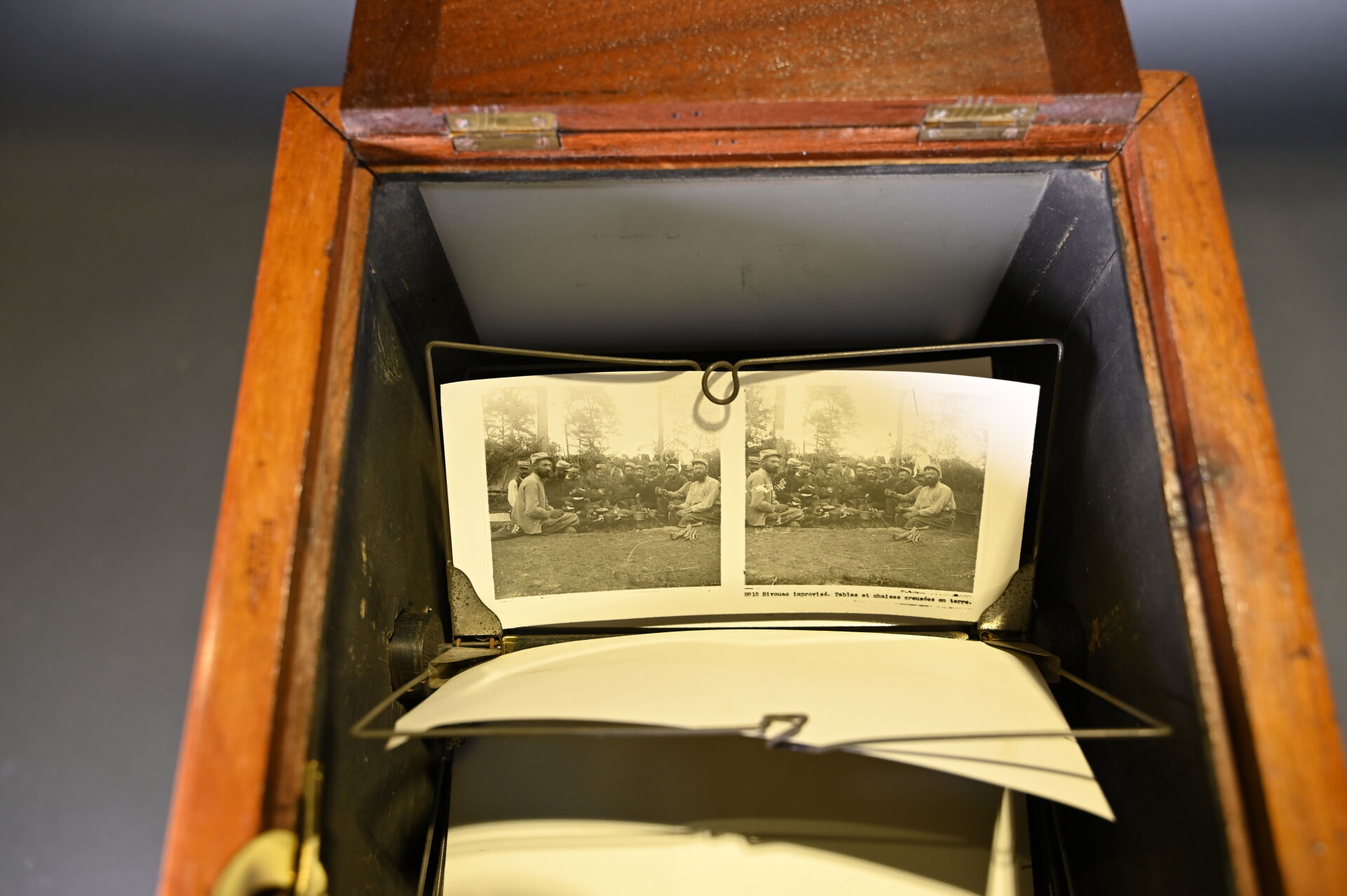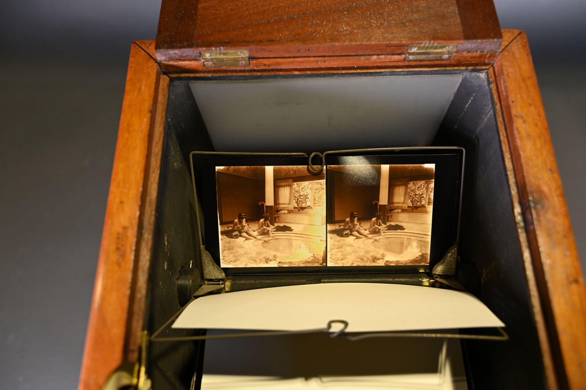 Visionneuse stéréoscopique de plaques en acajou moucheté, avec 45 plaques (Paris, Guerre 14-18, érotisme et divers). Haut. : 41 cm – Larg. : 29 cm – Prof. : 25,5 cm.