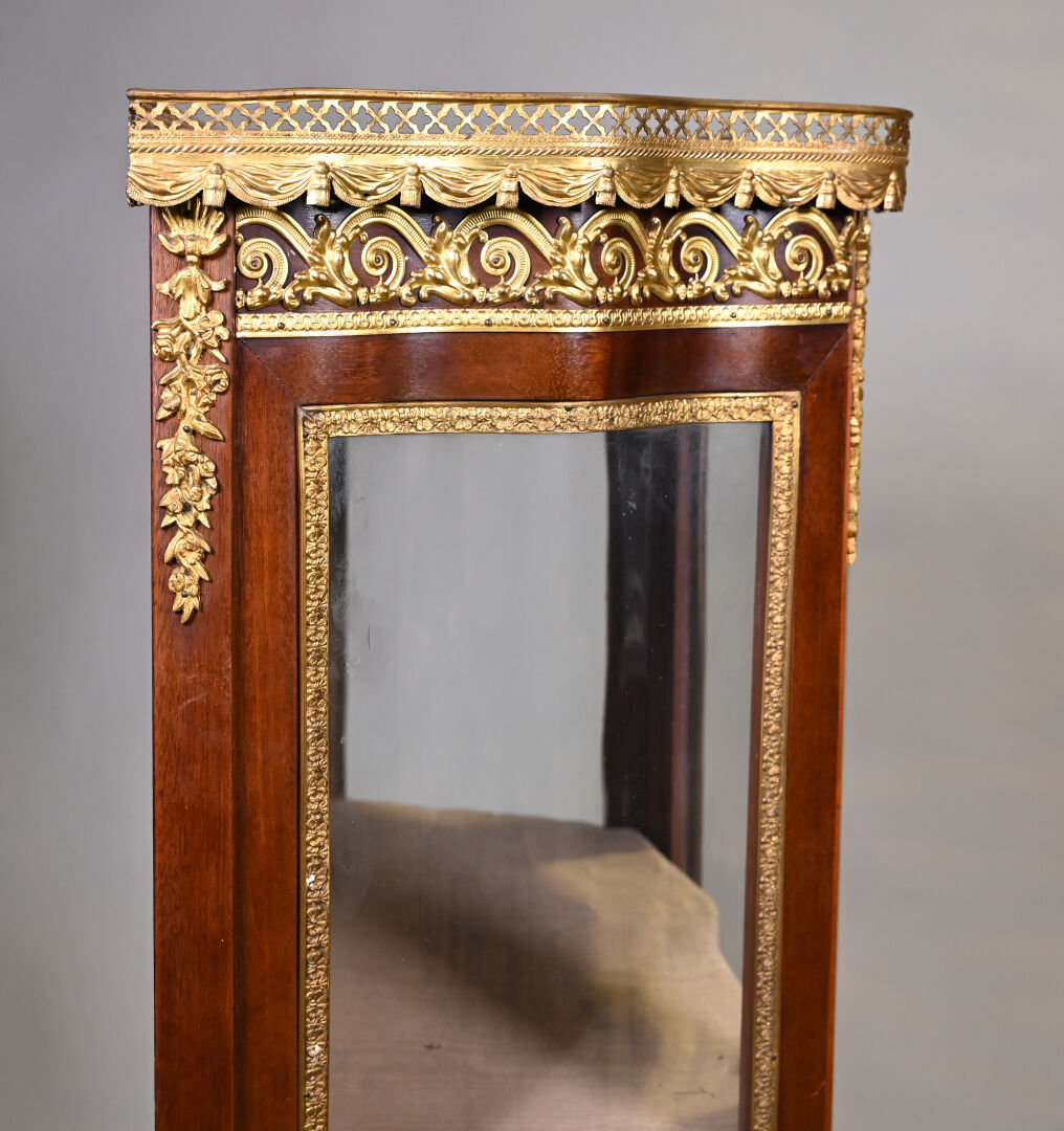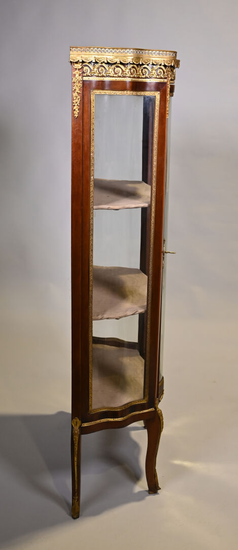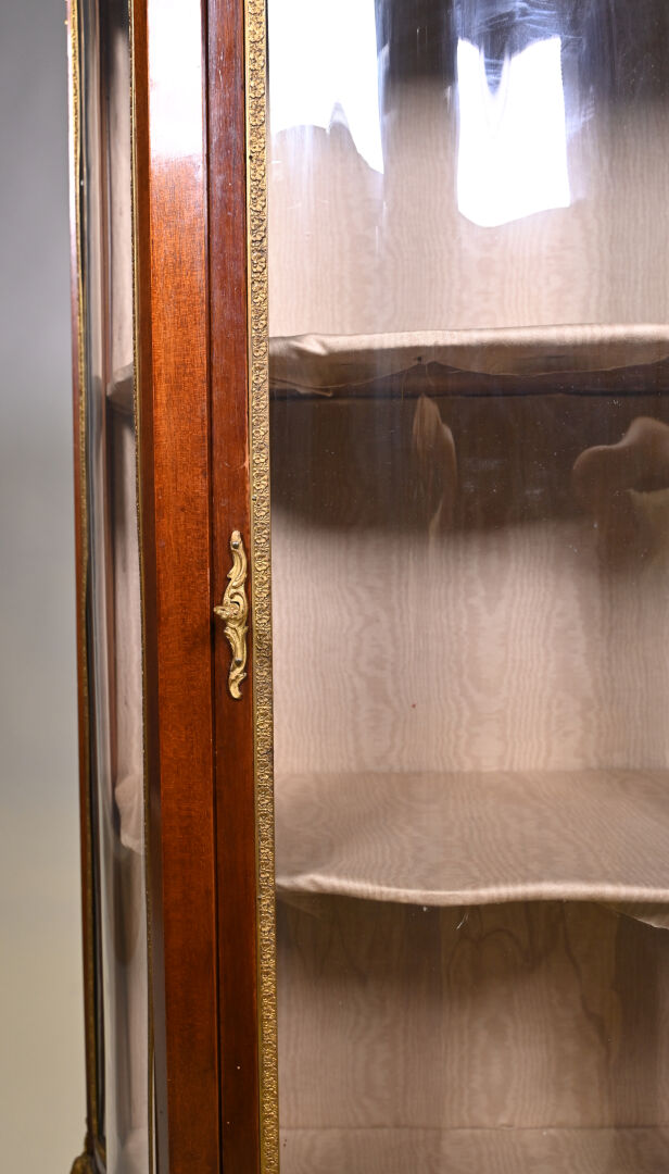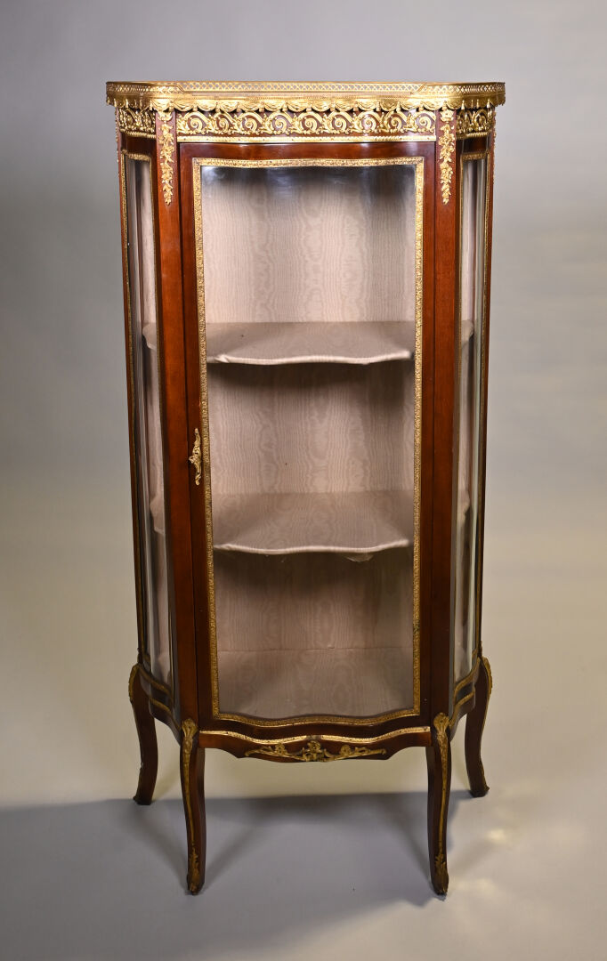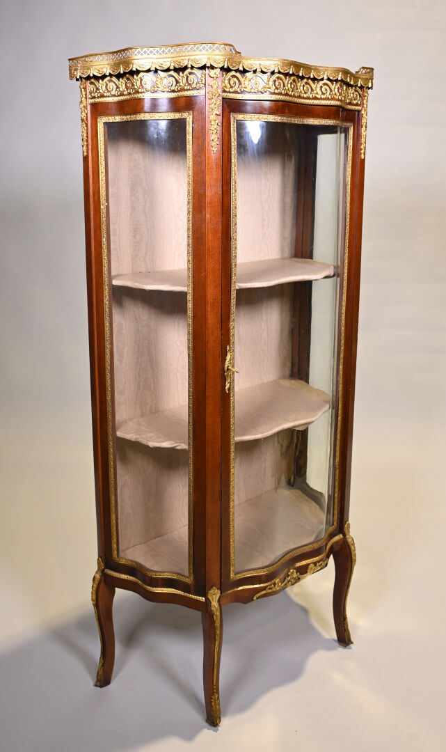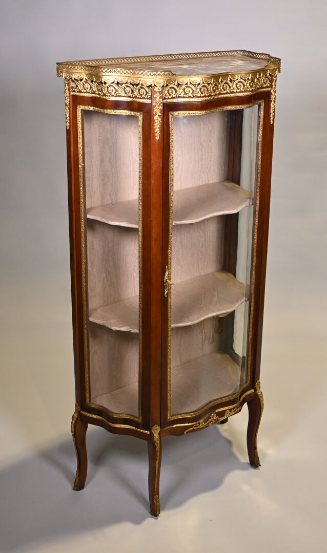 Vitrine de forme mouvementée à façade en arbalète en acajou et placage d’acajou, ouvrant par un vantail et reposant sur des pieds cambrés. Riche ornementation de bronzes ciselés et dorés tels que galerie à jour à frise de drapés, frises de postes feuillagés, chutes feuillagées et fleuries, baguettes d’encadrement, tablier, entrée de serrure et sabots. Plateau de marbre rouge des Flandres. Style Transition. 140 x 69 x 33 cm.
