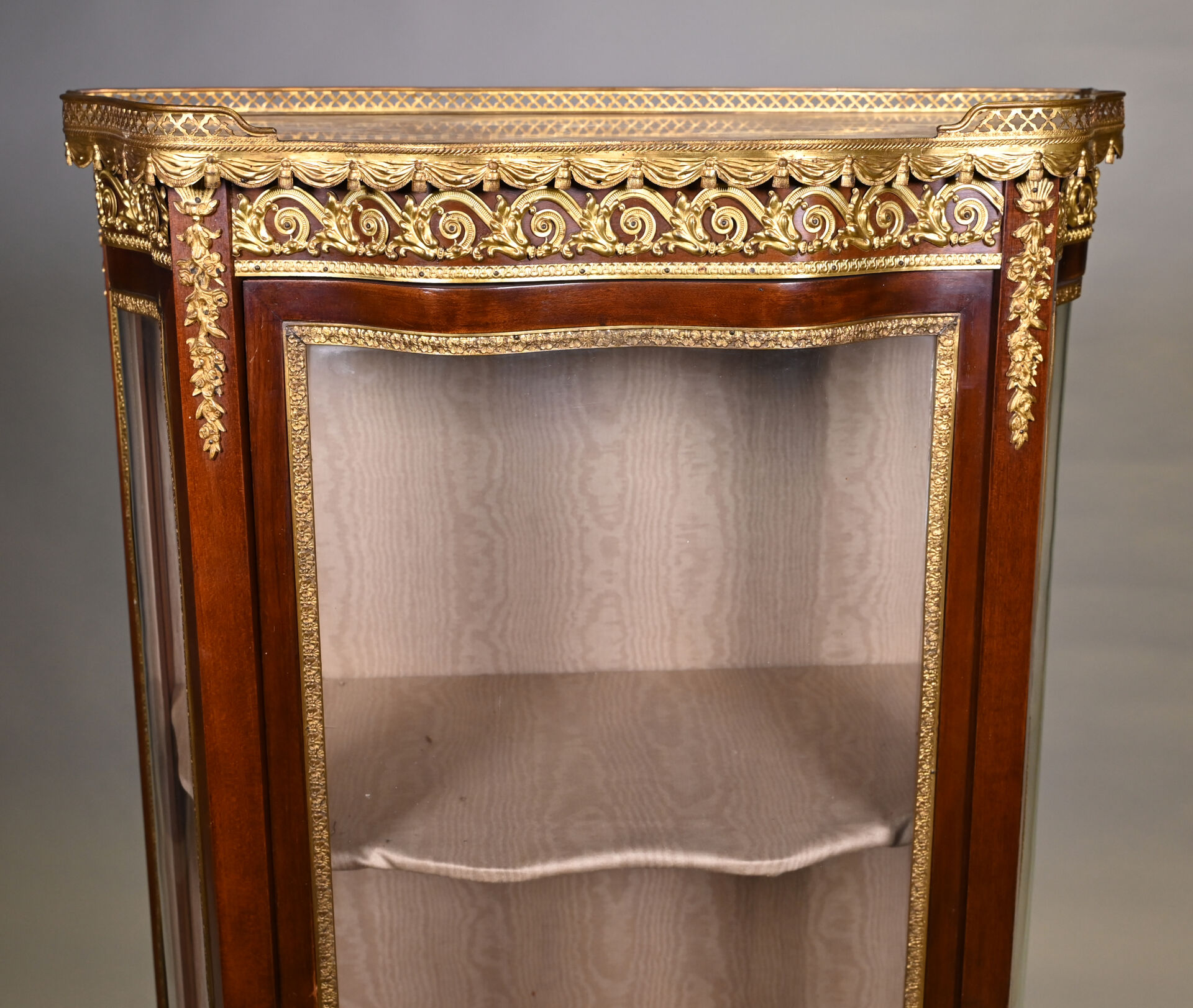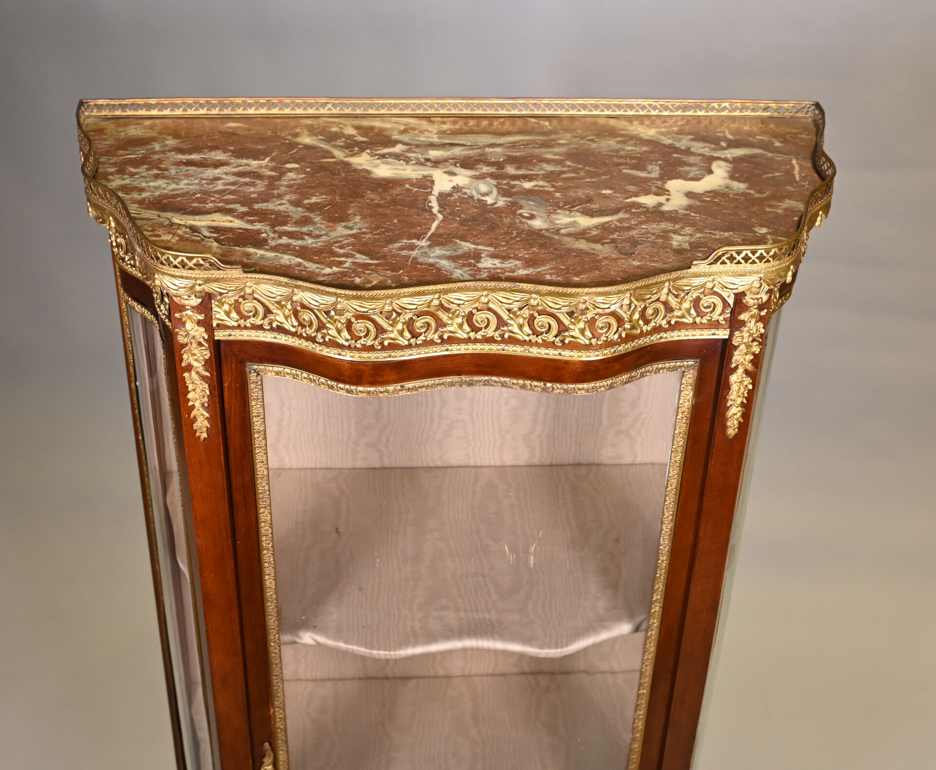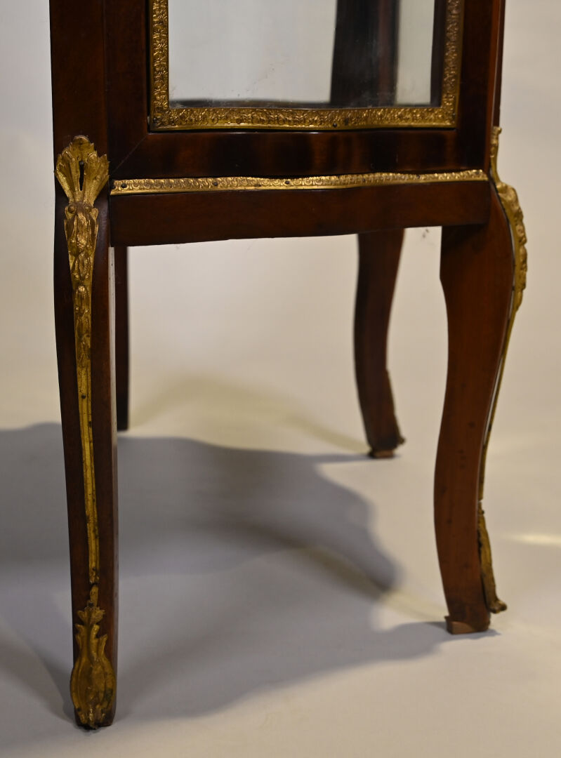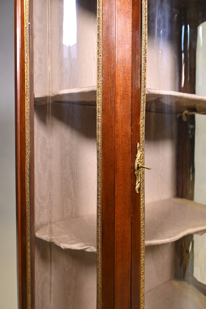 Vitrine de forme mouvementée à façade en arbalète en acajou et placage d’acajou, ouvrant par un vantail et reposant sur des pieds cambrés. Riche ornementation de bronzes ciselés et dorés tels que galerie à jour à frise de drapés, frises de postes feuillagés, chutes feuillagées et fleuries, baguettes d’encadrement, tablier, entrée de serrure et sabots. Plateau de marbre rouge des Flandres. Style Transition. 140 x 69 x 33 cm.