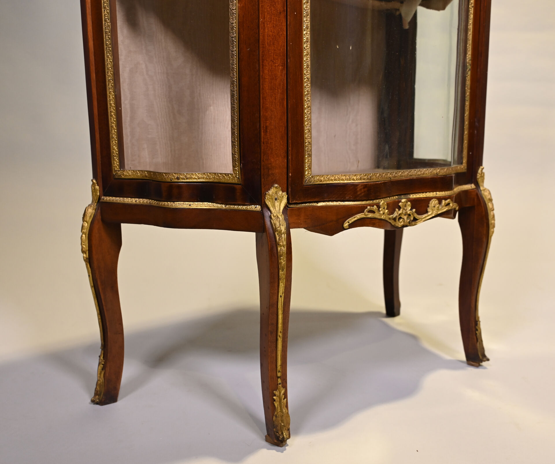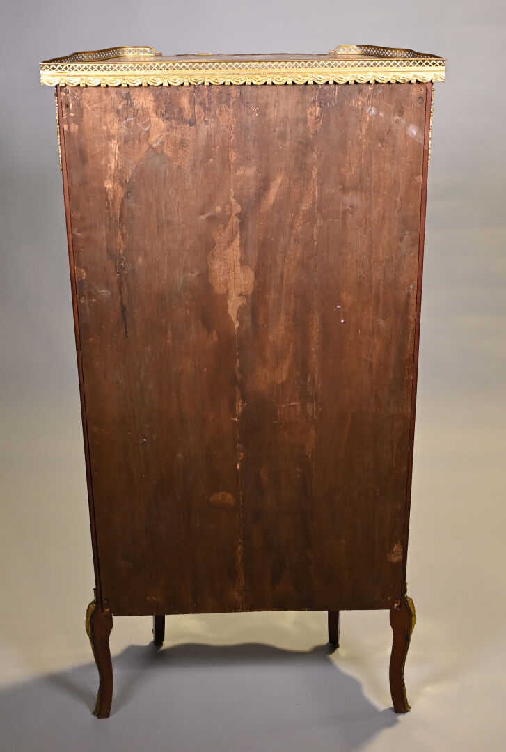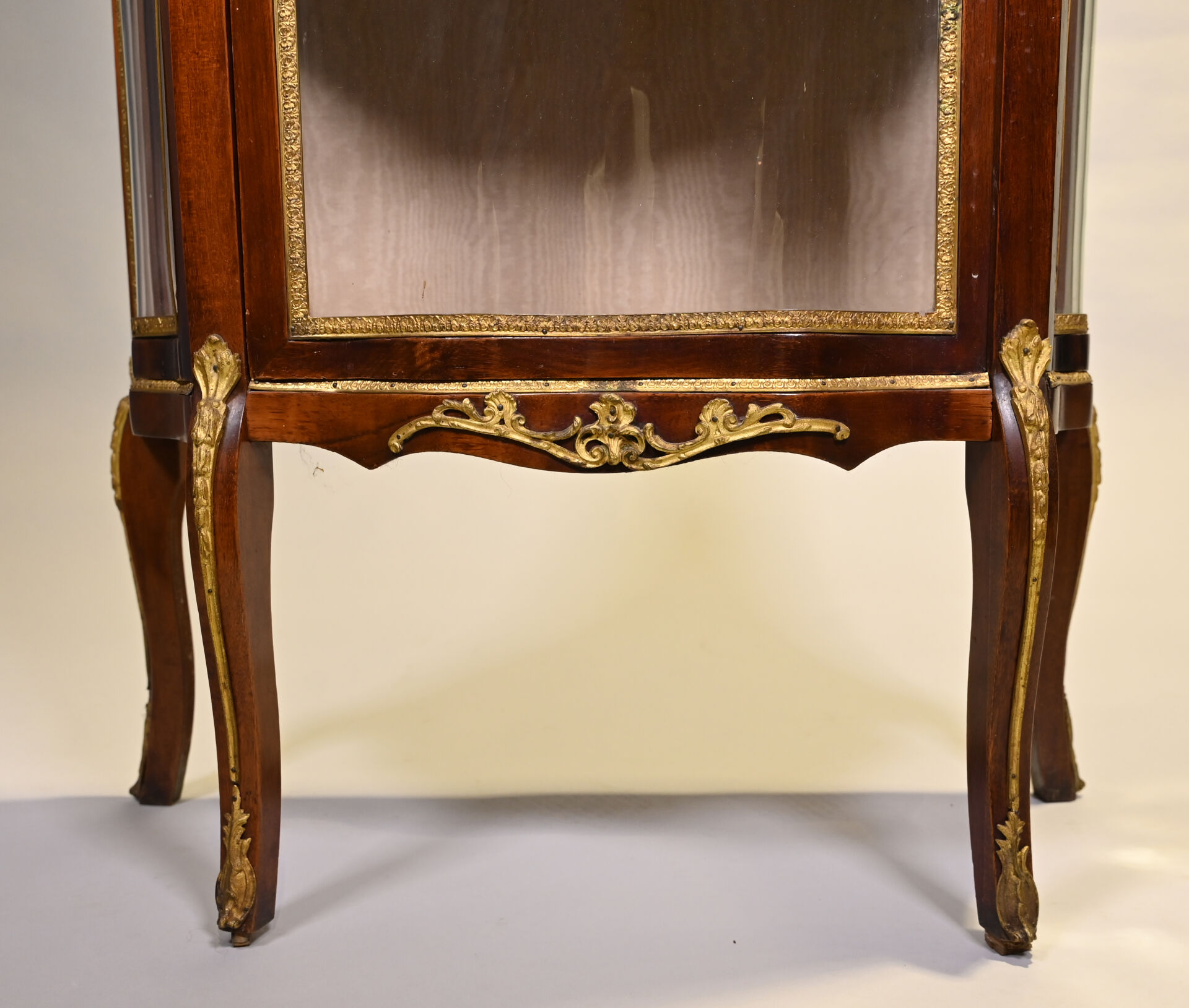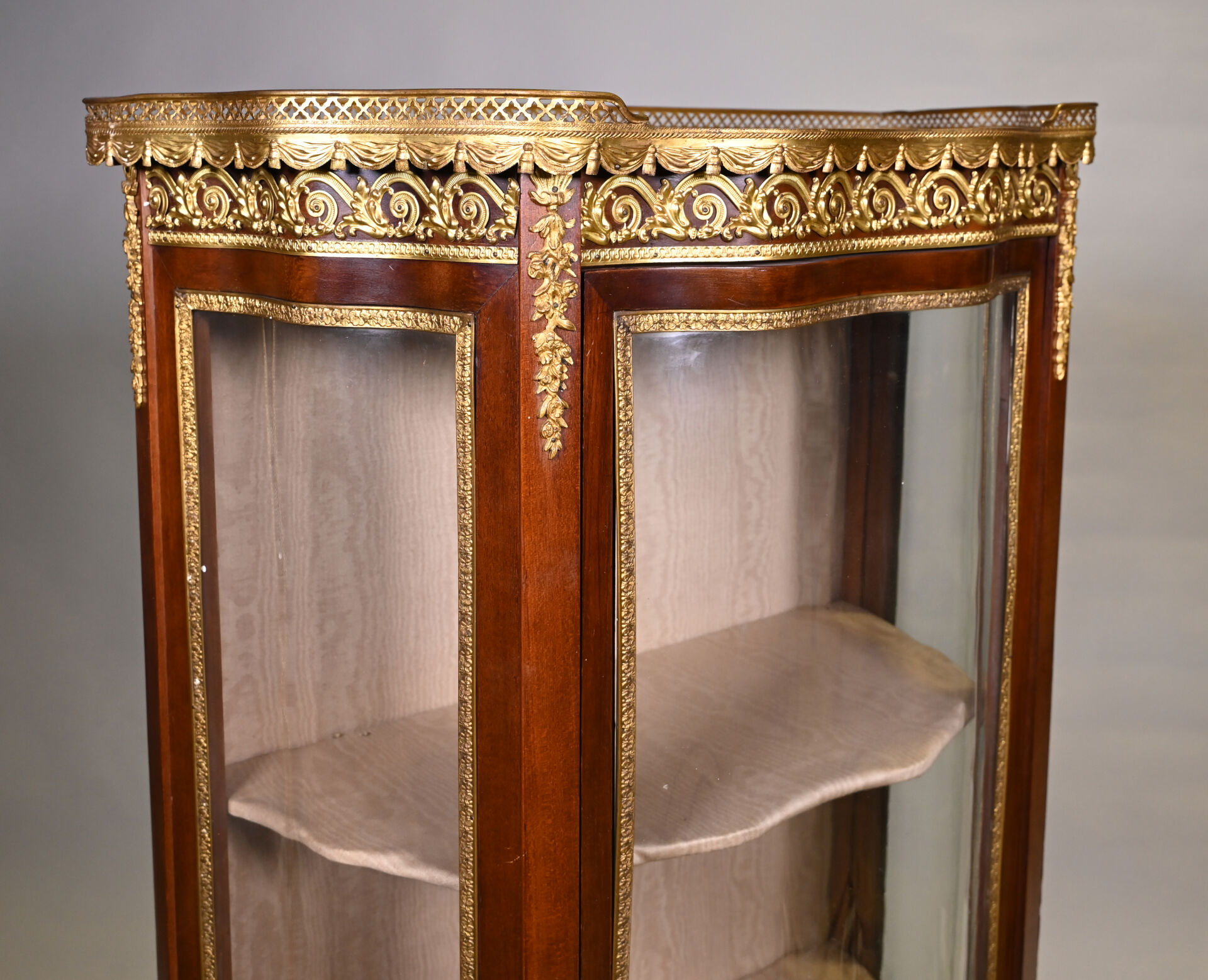 Vitrine de forme mouvementée à façade en arbalète en acajou et placage d’acajou, ouvrant par un vantail et reposant sur des pieds cambrés. Riche ornementation de bronzes ciselés et dorés tels que galerie à jour à frise de drapés, frises de postes feuillagés, chutes feuillagées et fleuries, baguettes d’encadrement, tablier, entrée de serrure et sabots. Plateau de marbre rouge des Flandres. Style Transition. 140 x 69 x 33 cm.