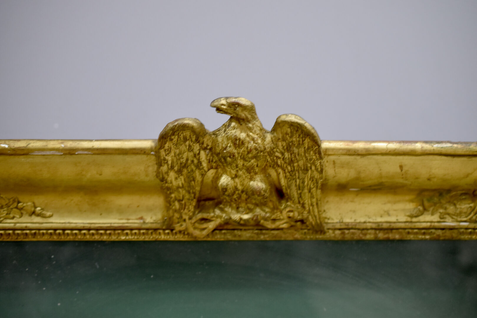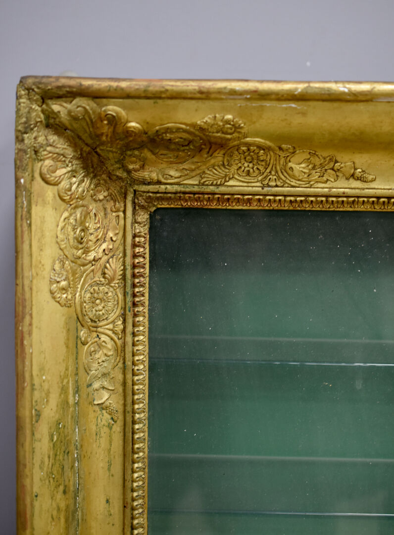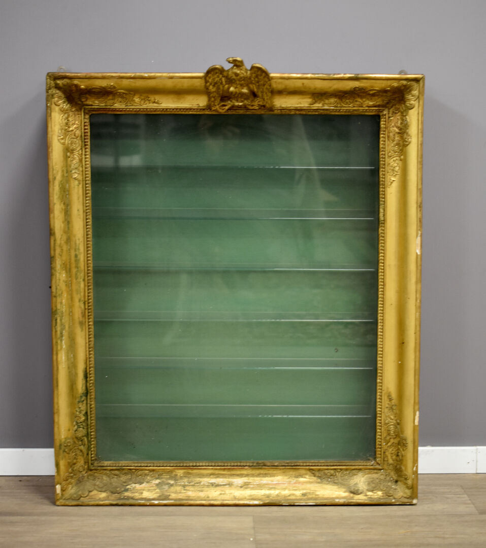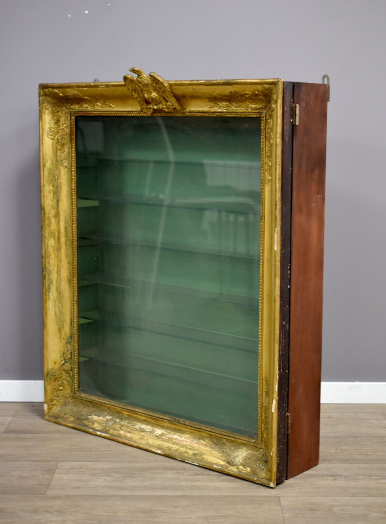 Vitrine murale en bois sculpté stuqué doré, le fronton formé par un aigle (éclats, manques, fente). En partie d’Epoque Empire (partie arrière de la caisse rapportée). Haut. : 92 cm – Larg. : 73,5 cm – Prof. : 24,5 cm.
