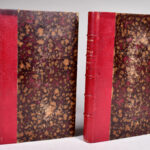 VOLTAIRE. LA PUCELLE D’ORLÉANS. Poème en vingt et un chants. Rouen, Lemonnyer, 1880. Deux volumes in-8 ½ maroquin rouge, dos à nerfs, titre doré, supra-libris « Bib. E. de G. » doré en queue, tête dorée (Reliure de l’époque). Tache brune en tête d’un plat. ÉDITION ILLUSTRÉE d’un PORTRAIT et d’une FIGURE en frontispice de chaque tome, de 2 vignettes de titre et de 21 têtes-de-chapitre gravées en taille-douce d’après Duplessis-Bertaux. UN des 150 EXEMPLAIRES numérotés sur vélin de Hollande. Probable exemplaire d’Edmond de Goncourt avec ses initiales « Bib. E. de G. » dorées en queue du dos de chaque volume, puis bibliothèque Paul Izoard avec son ex-libris gravé.
