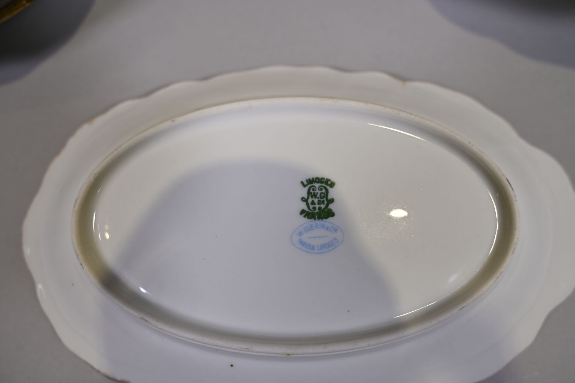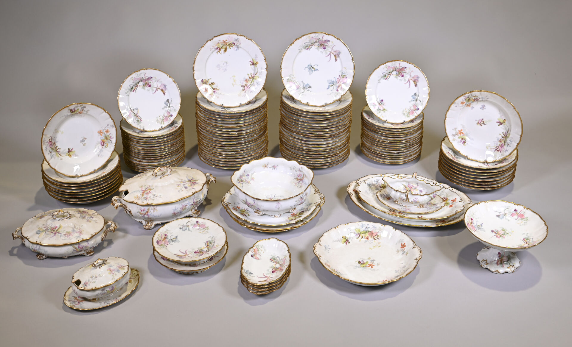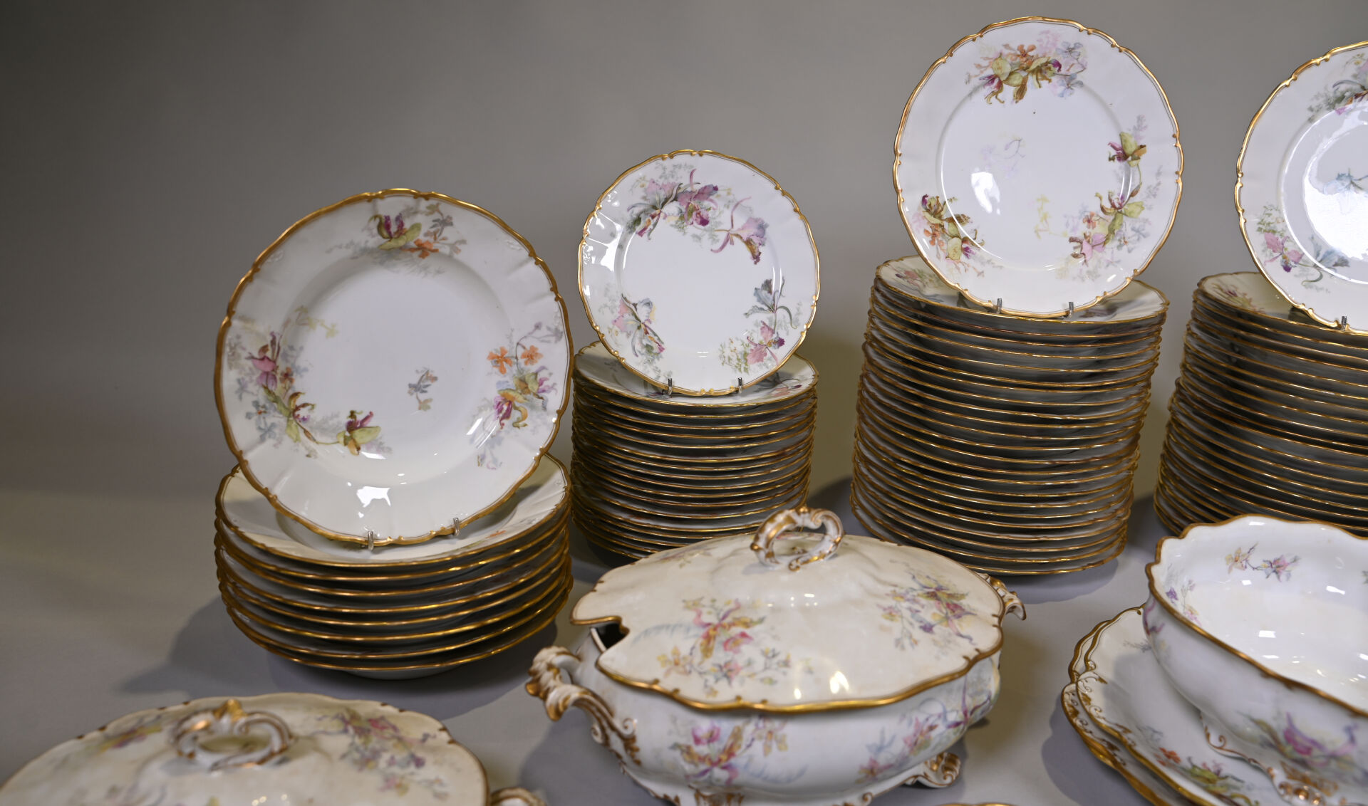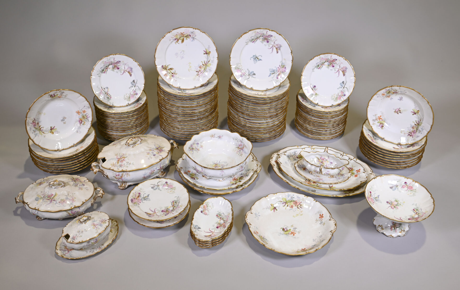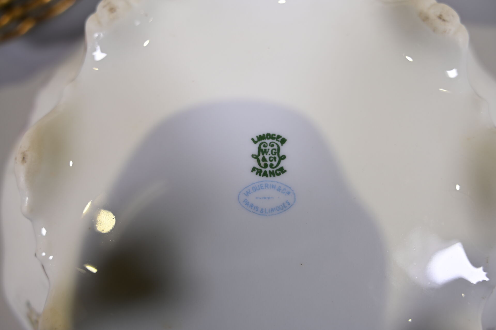 W GUERIN & CIE Limoges. Partie de service de table en porcelaine blanche à décor décalcomanié de fleurs, la bordure chantournée à liseré or. Marqué au dessous.