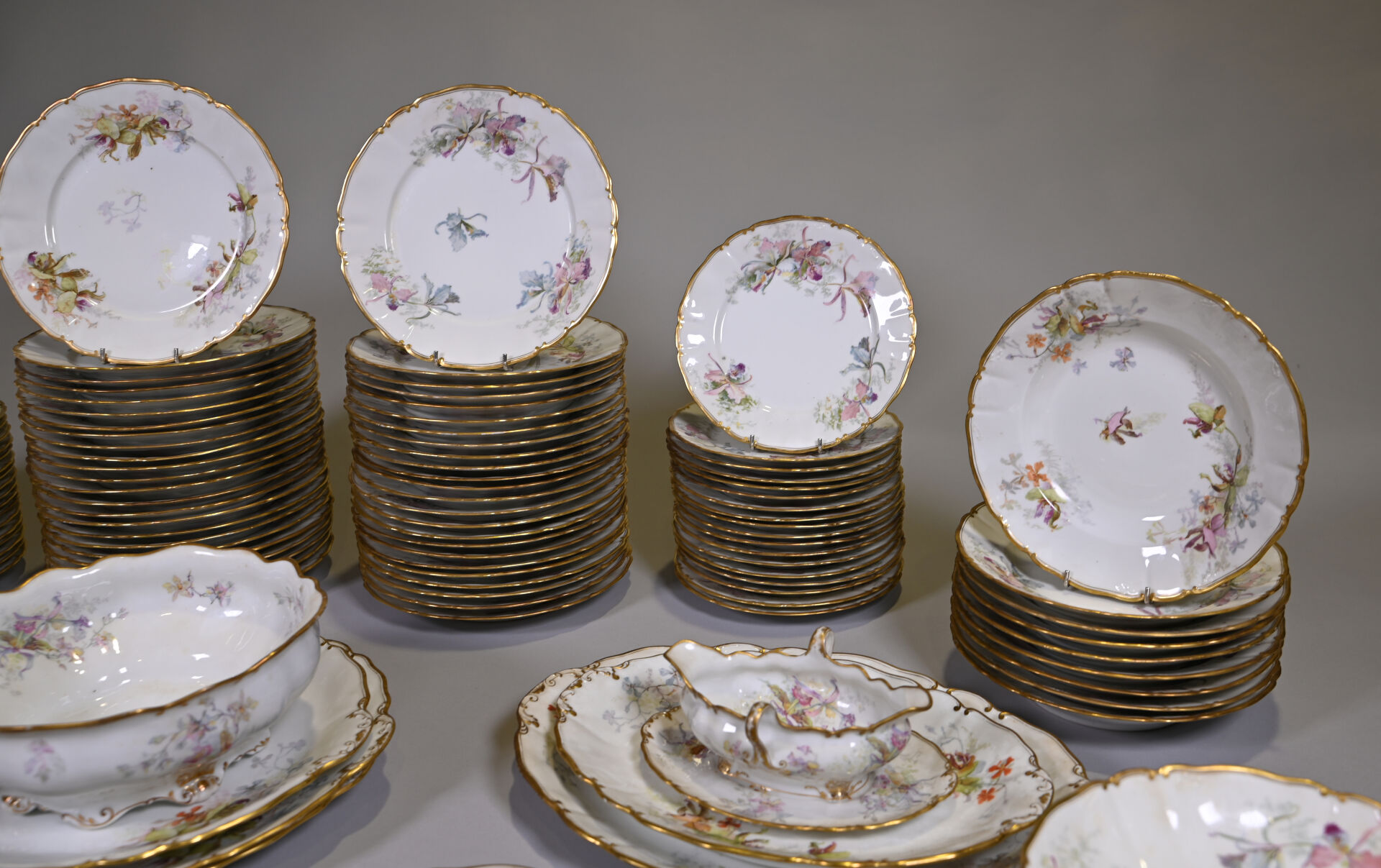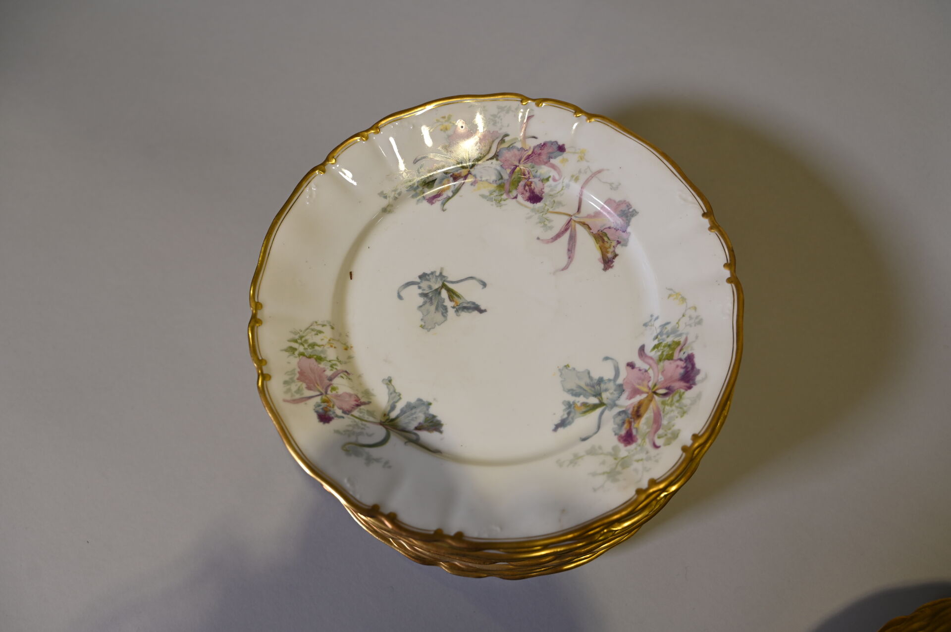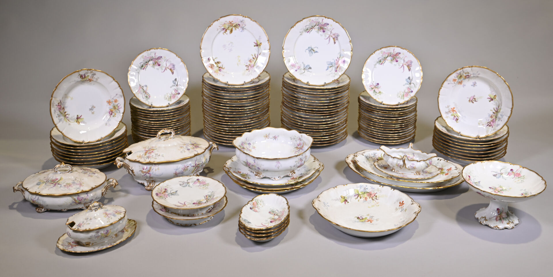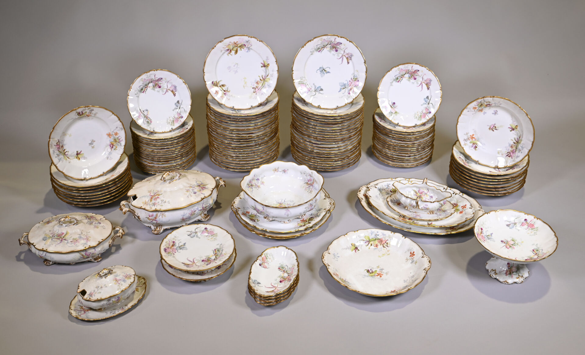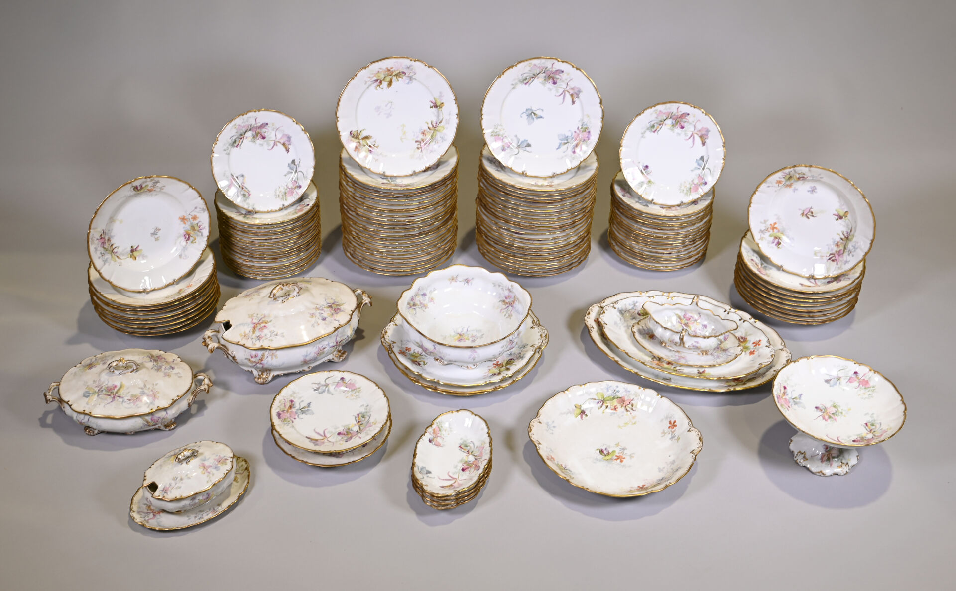 W GUERIN & CIE Limoges. Partie de service de table en porcelaine blanche à décor décalcomanié de fleurs, la bordure chantournée à liseré or. Marqué au dessous.