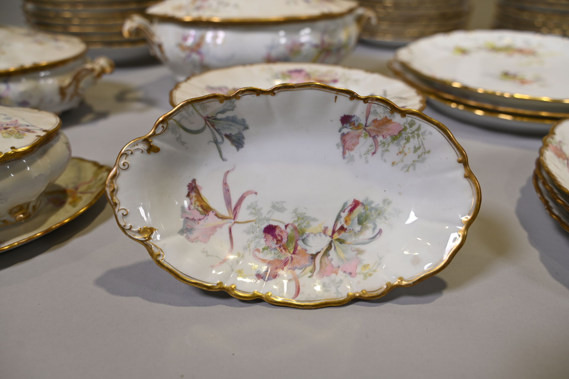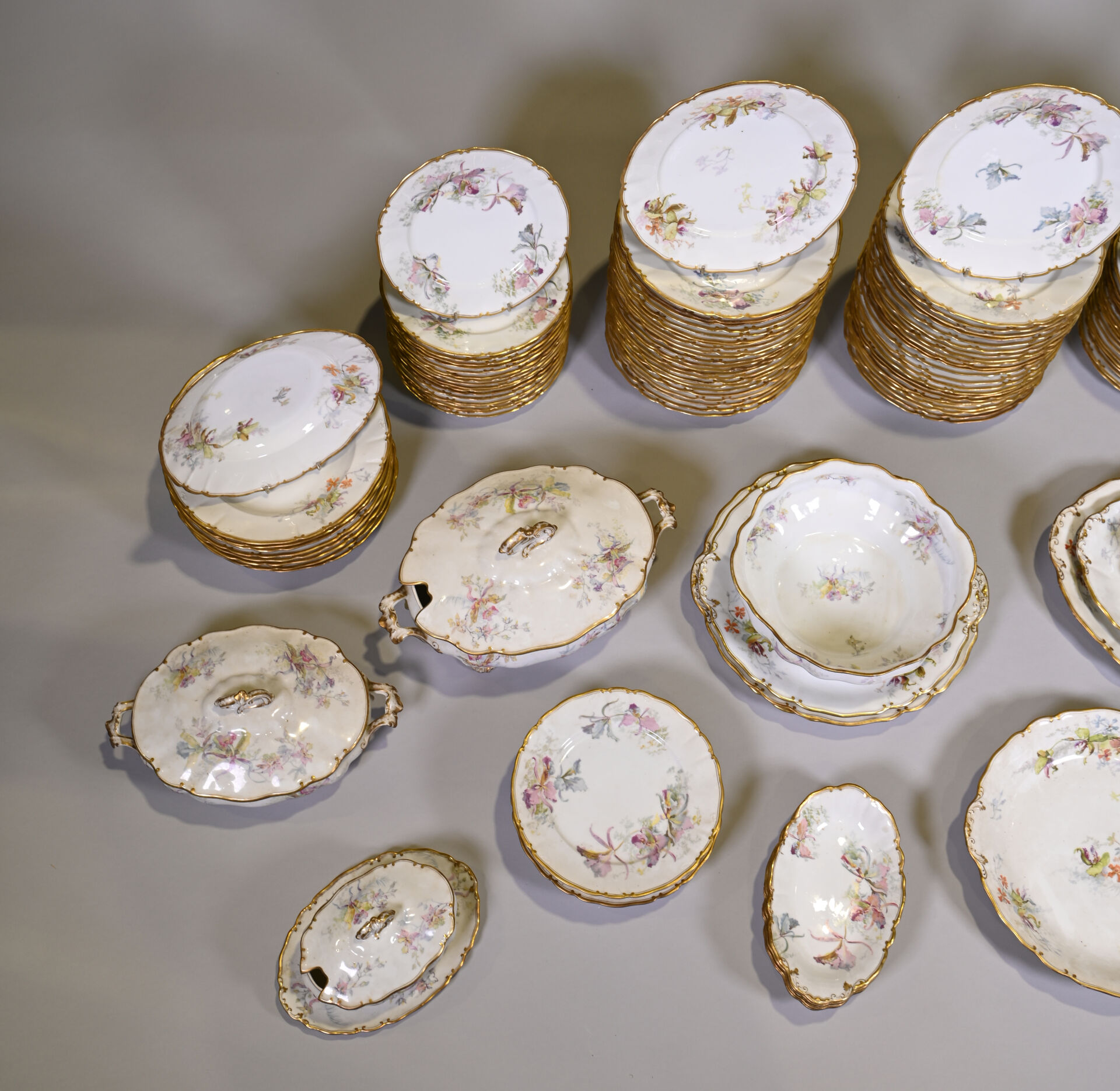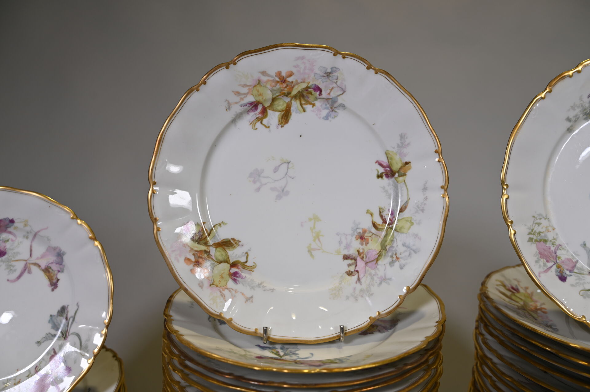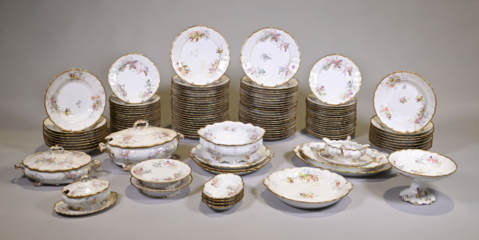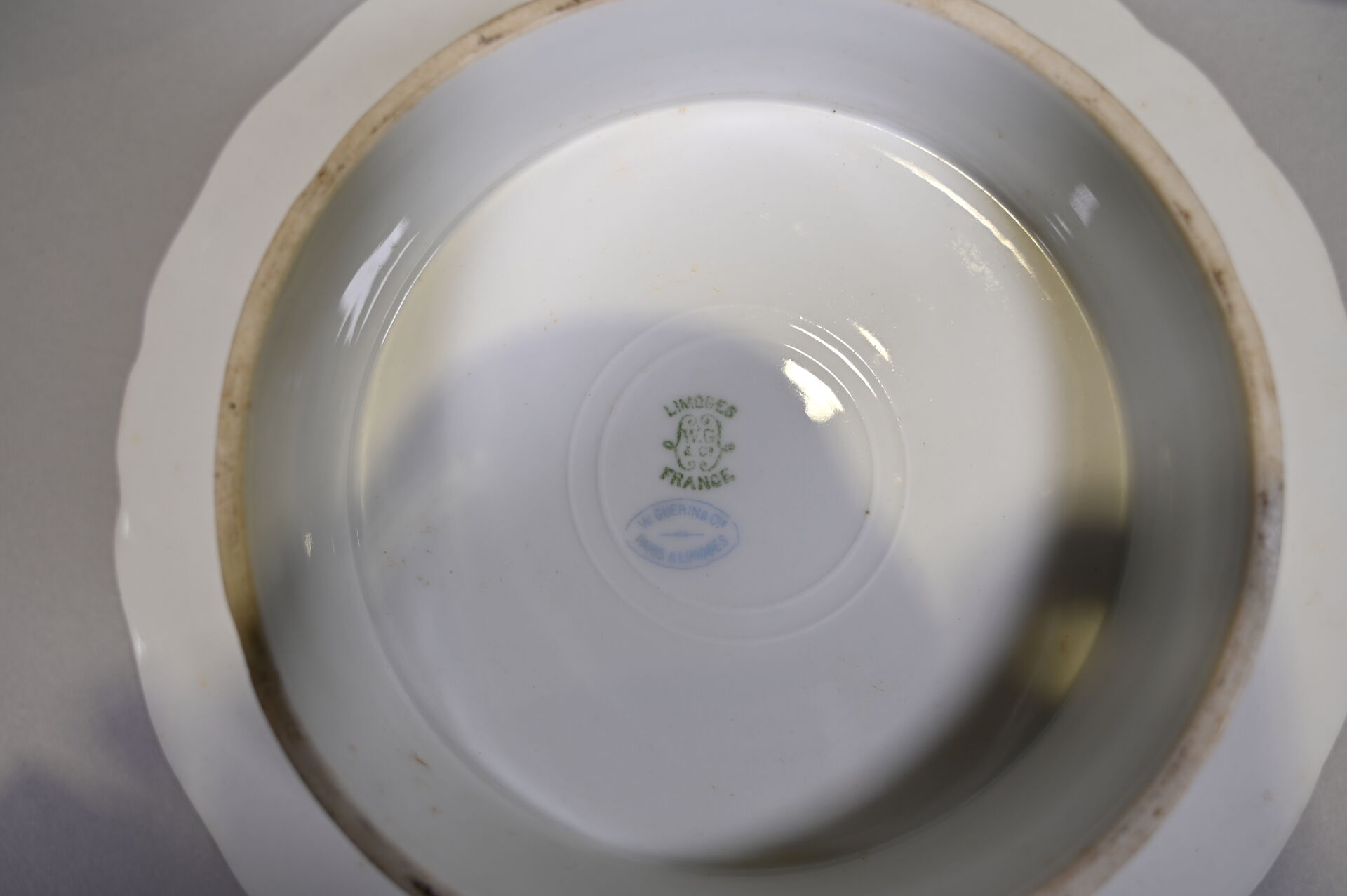 W GUERIN & CIE Limoges. Partie de service de table en porcelaine blanche à décor décalcomanié de fleurs, la bordure chantournée à liseré or. Marqué au dessous.