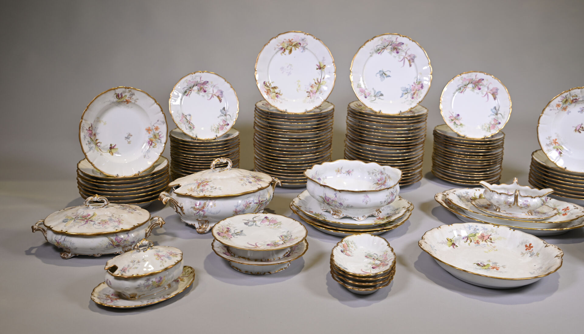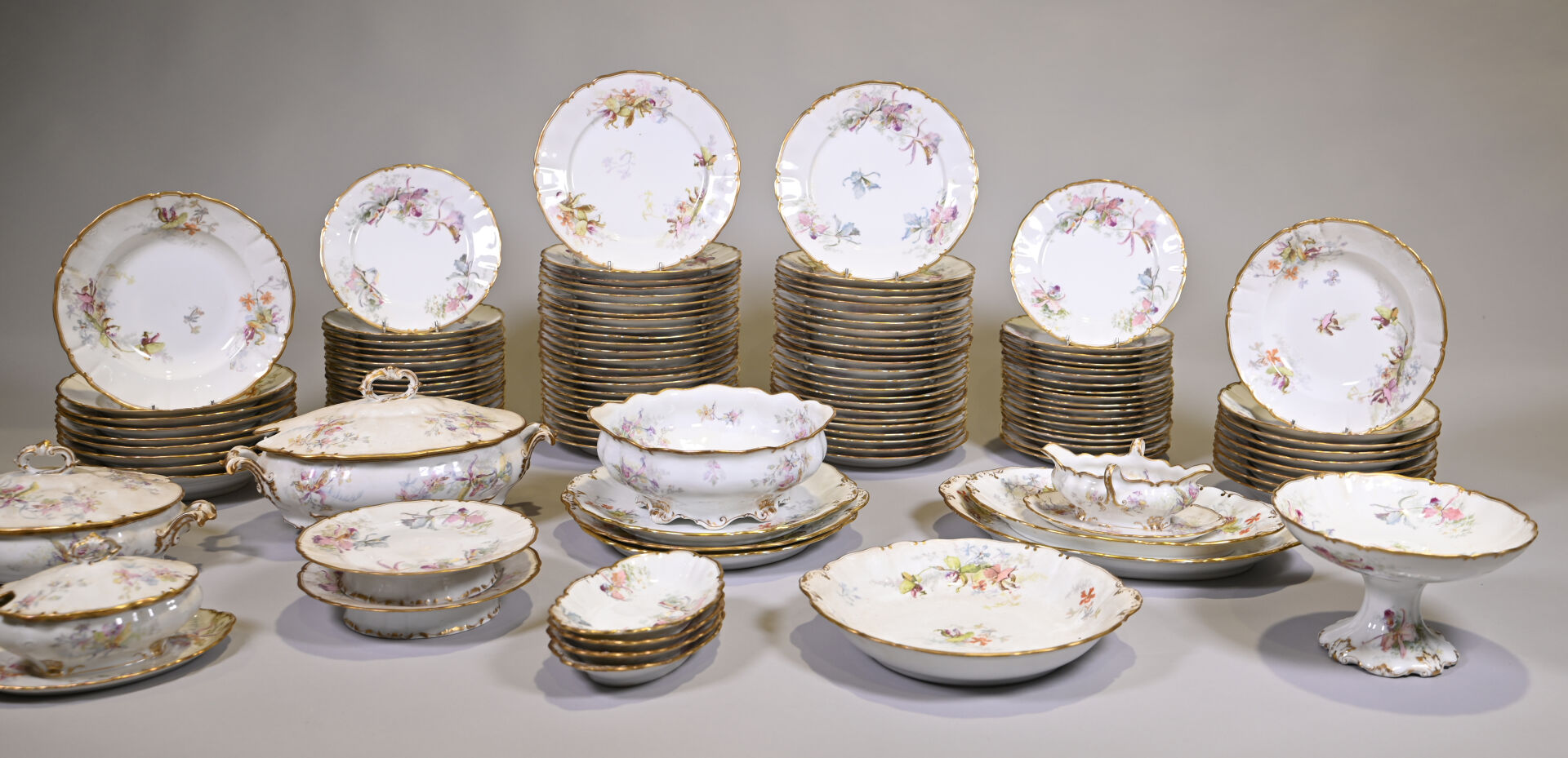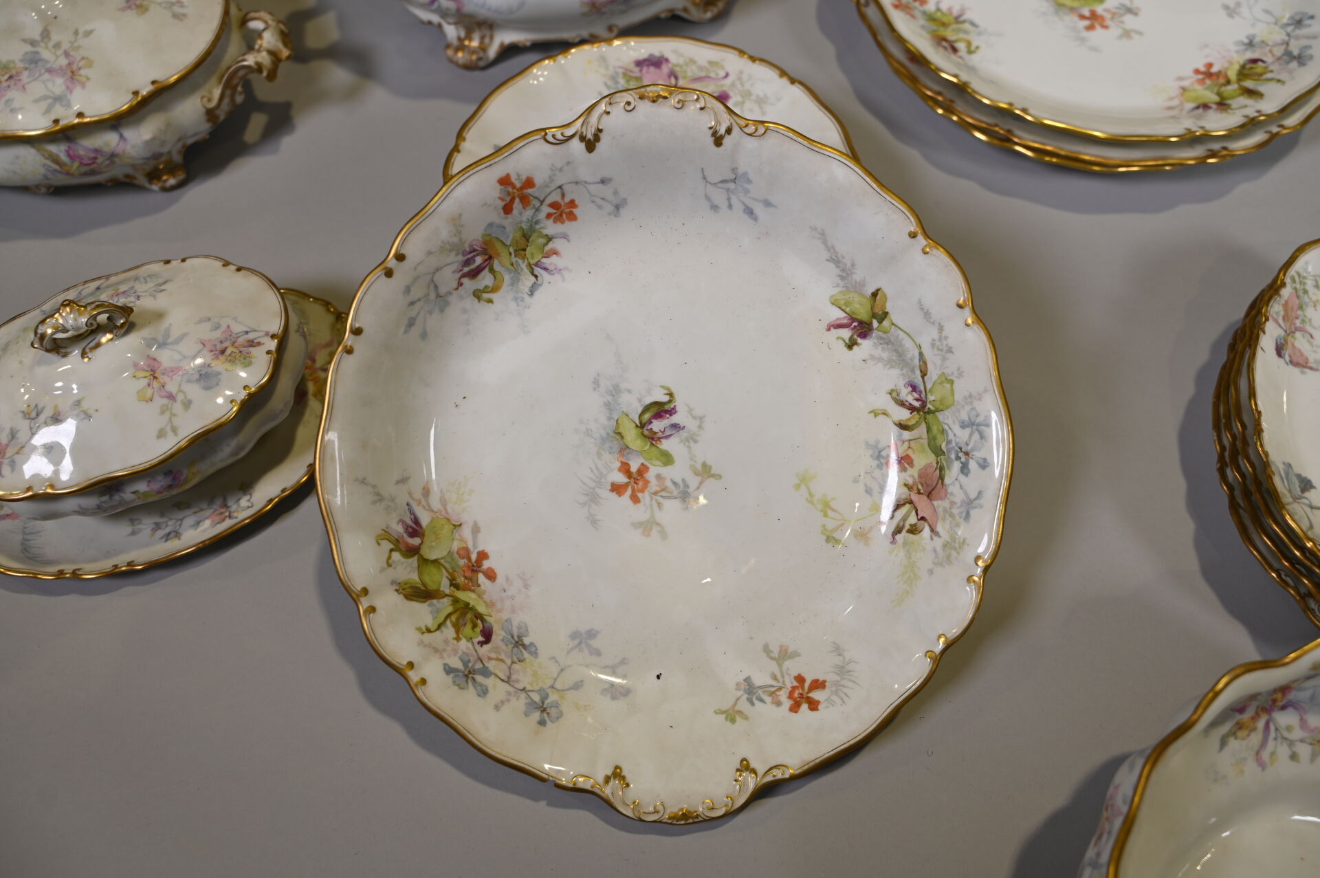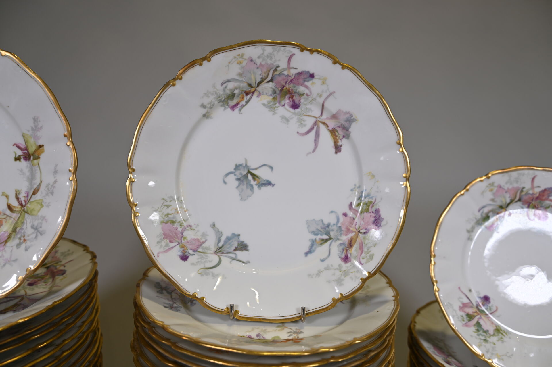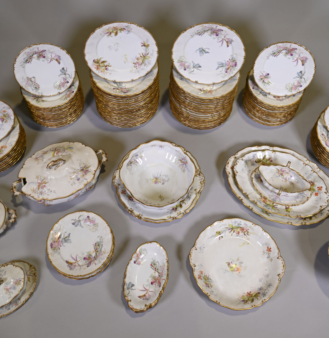 W GUERIN & CIE Limoges. Partie de service de table en porcelaine blanche à décor décalcomanié de fleurs, la bordure chantournée à liseré or. Marqué au dessous.