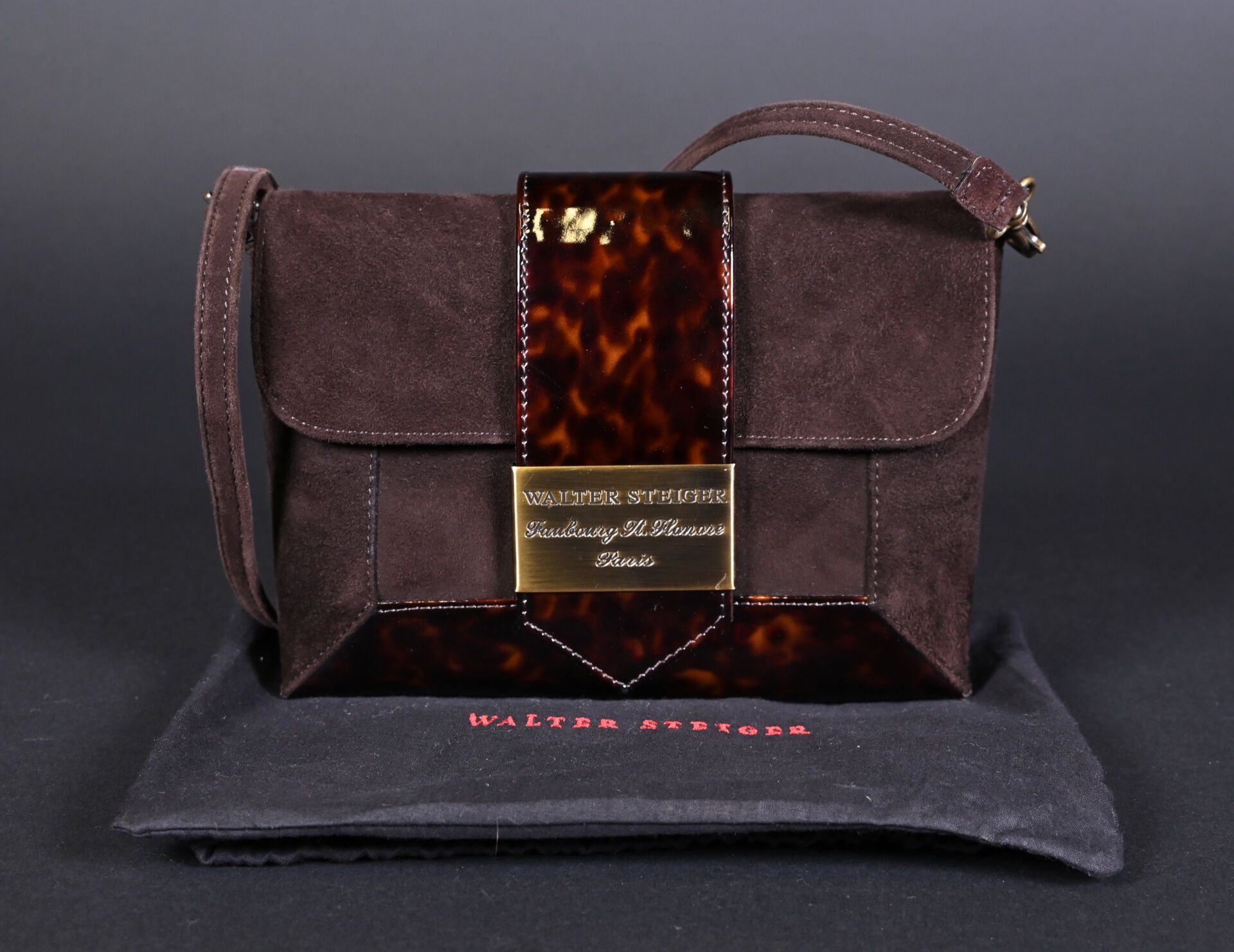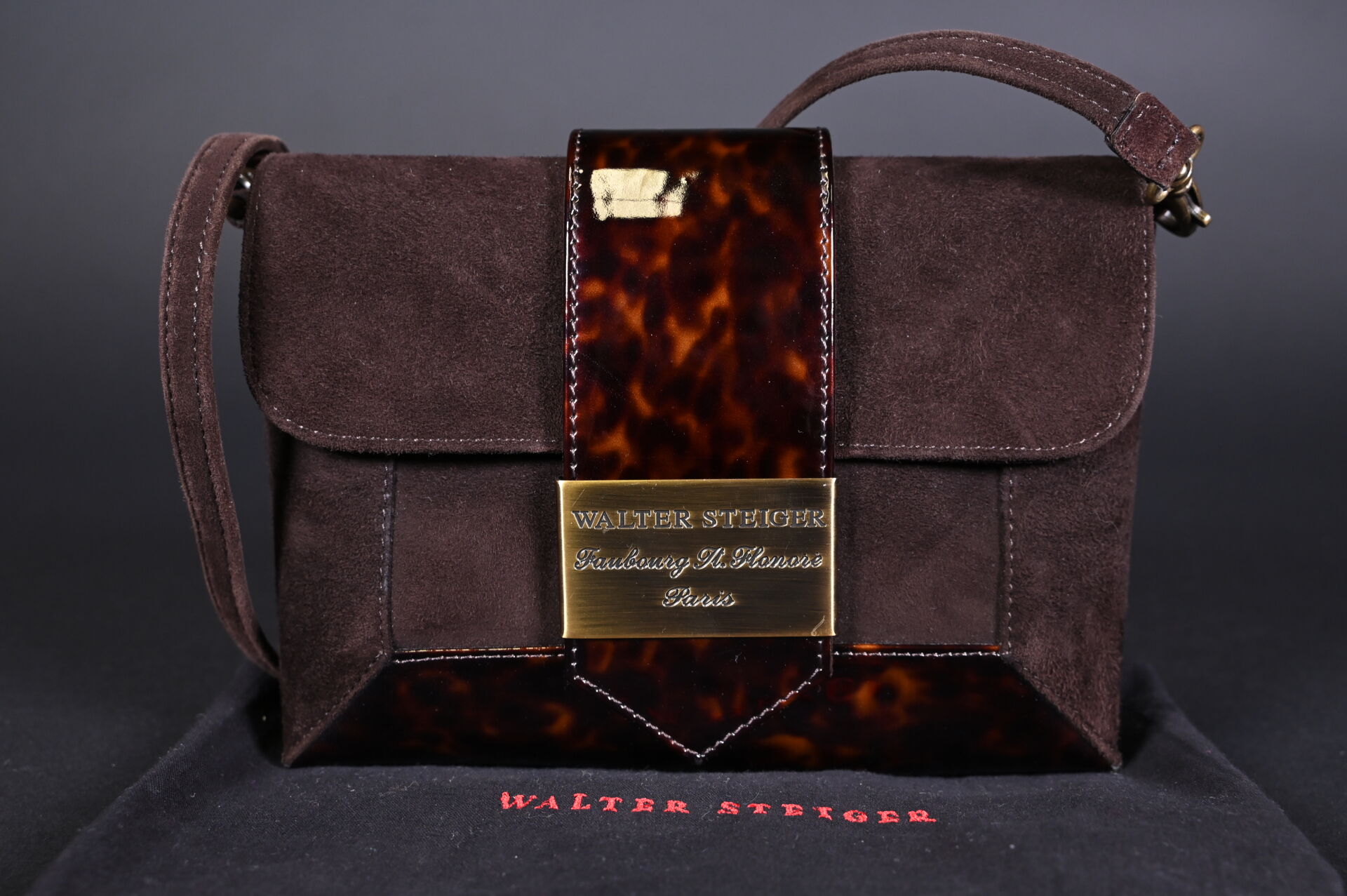 WALTER STEIGER. Sac à main en daim chocolat plastique façon écaille brune. Dustbag. Haut. : 16 cm – Larg. : 12 cm – Prof. : 8 cm.