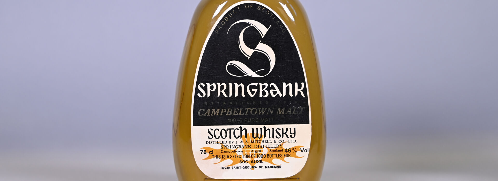 WHISKY – 1 bouteille, Whisky (Campbeltown, Ecosse), Springbank, Pure Malt, 15 ans. En étui d’origine (légèrement sale et abimé). Collerette très légèrement abimée. Contre-étiquette très dégradée.