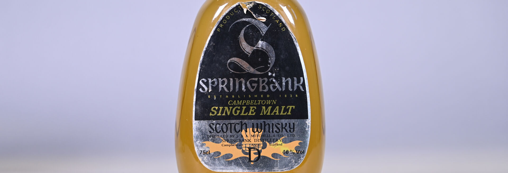 WHISKY – 1 bouteille, Whisky (Campbeltown, Ecosse), Springbank, Single Malt, 15 ans. En étui d’origine (légèrement sale). Collerette très légèrement abimée. Etiquette abimée avec une déchirure dans sa partie supérieure. Contre-étiquette très dégradée.