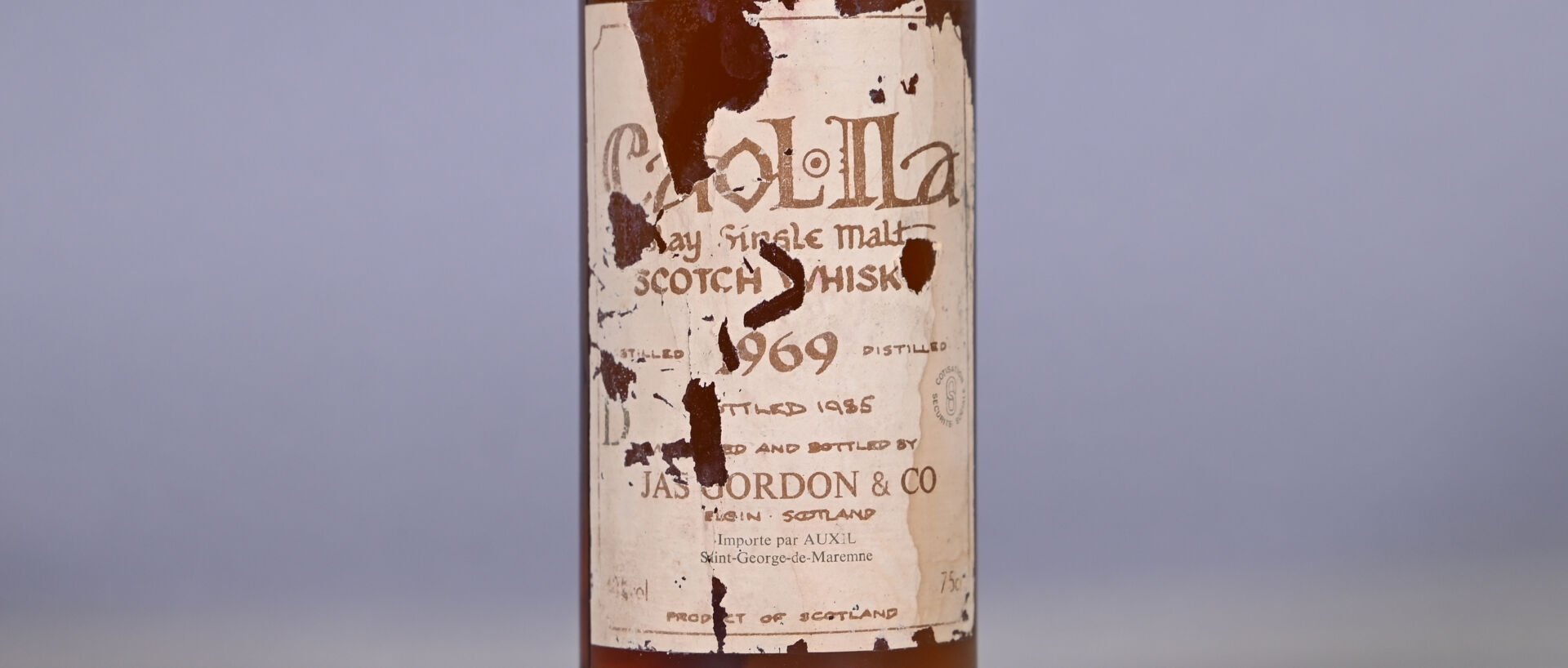 WHISKY – 1 bouteille, Whisky (Islay, Ecosse), Caol Ila, Single Malt, distillé en 1969 et mis en bouteille en 1985 par Jas Gordon and Co. Capsule avec une petite trace de frottement. Etiquette dégradée à très dégradée, sale, tachée et fragile.