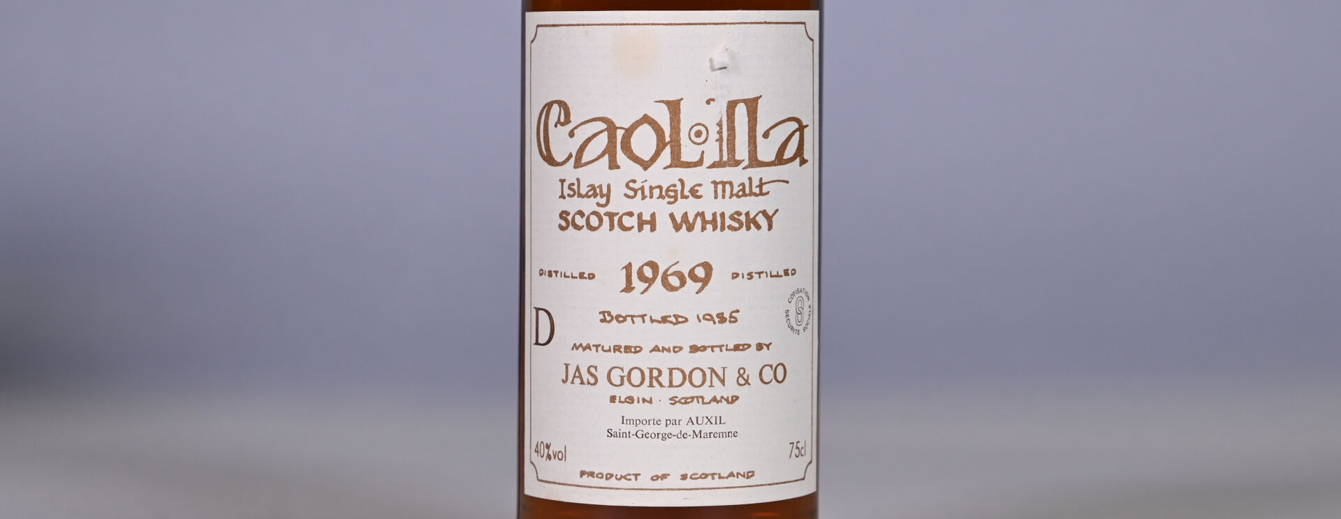 WHISKY – 1 bouteille, Whisky (Islay, Ecosse), Caol Ila, Single Malt, distillé en 1969 et mis en bouteille en 1985 par Jas Gordon and Co. En étui. Niveau légèrement bas. Etiquette avec une petite déchirure.