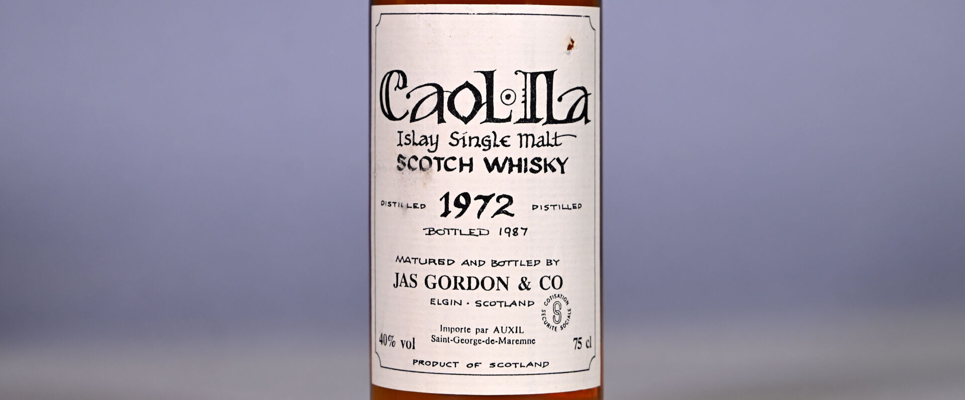 WHISKY – 1 bouteille, Whisky (Islay, Ecosse), Caol Ila, Single Malt, distillé en 1972 et mis en bouteille en 1987 par Jas Gordon and Co. En étui (sale et abimé). Niveau légèrement bas. Etiquette avec de légères traces et un petit accroc.
