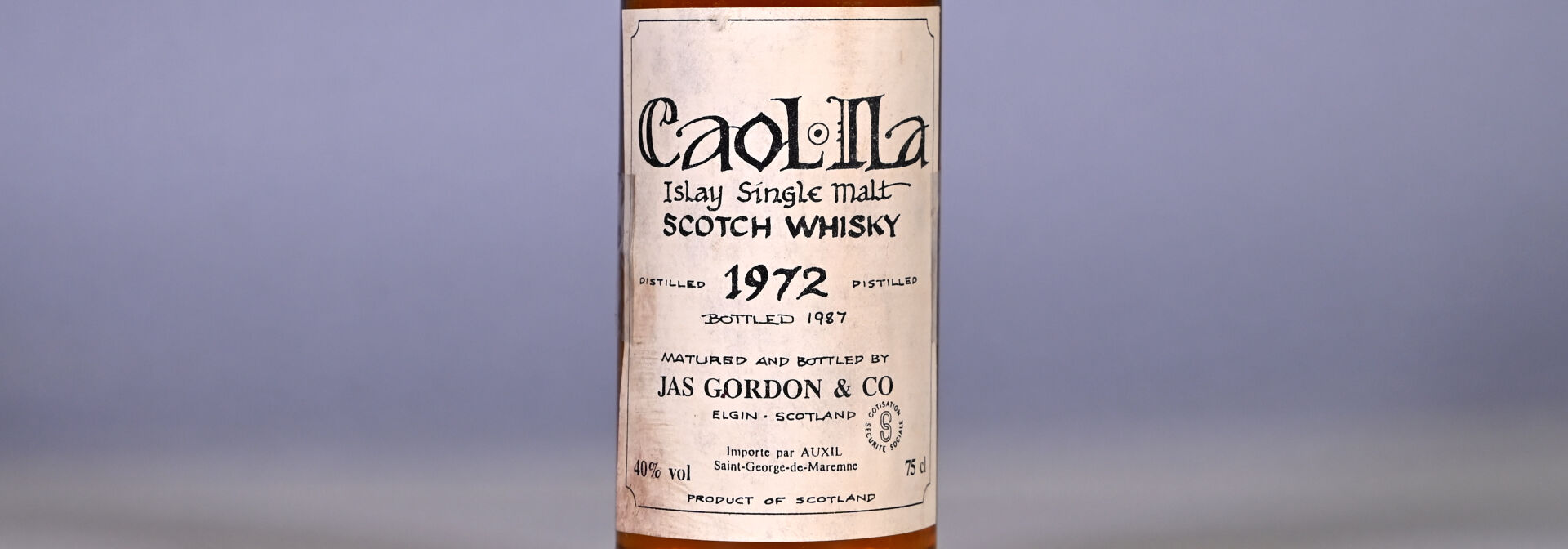 WHISKY – 1 bouteille, Whisky (Islay, Ecosse), Caol Ila, Single Malt, distillé en 1972 et mis en bouteille en 1987 par Jas Gordon and Co. En étui (très sale et abimé). Etiquette entièrement décollée, légèrement sale avec une petite égratignure dans sa partie supérieure.