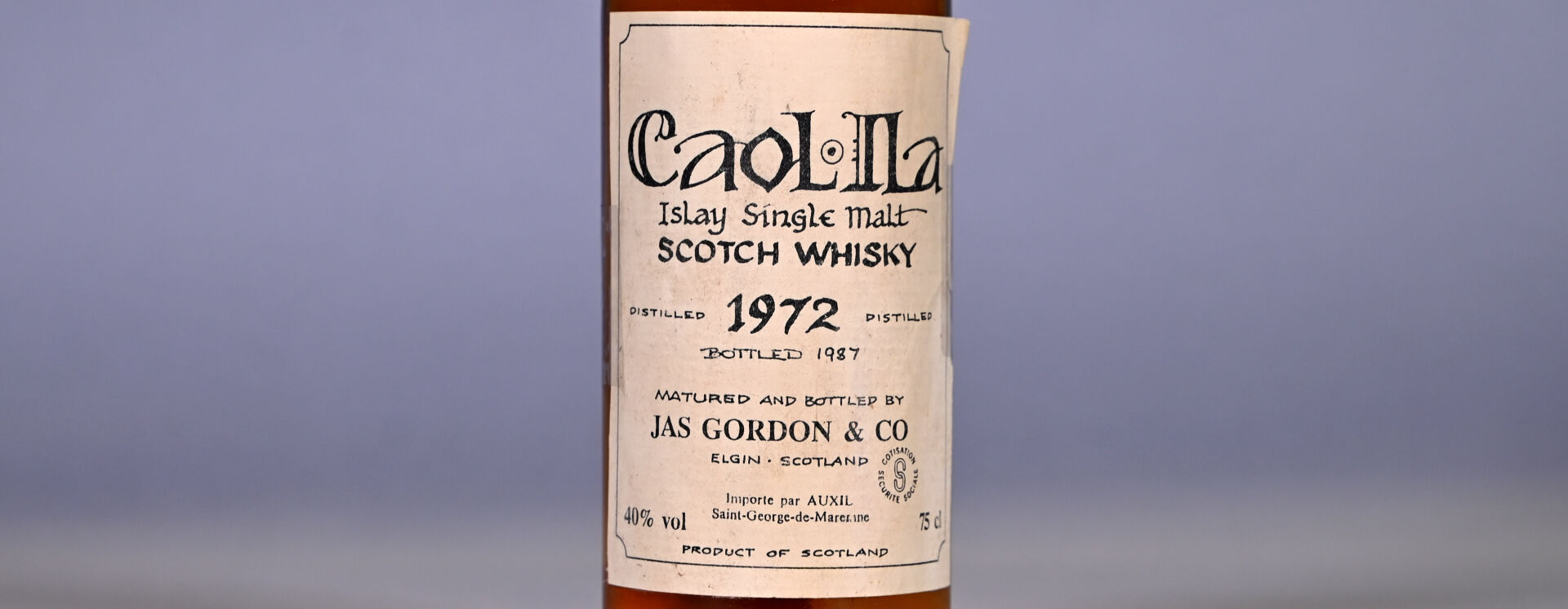 WHISKY – 1 bouteille, Whisky (Islay, Ecosse), Caol Ila, Single Malt, distillé en 1972 et mis en bouteille en 1987 par Jas Gordon and Co. Etiquette entièrement décollée et légèrement sale.