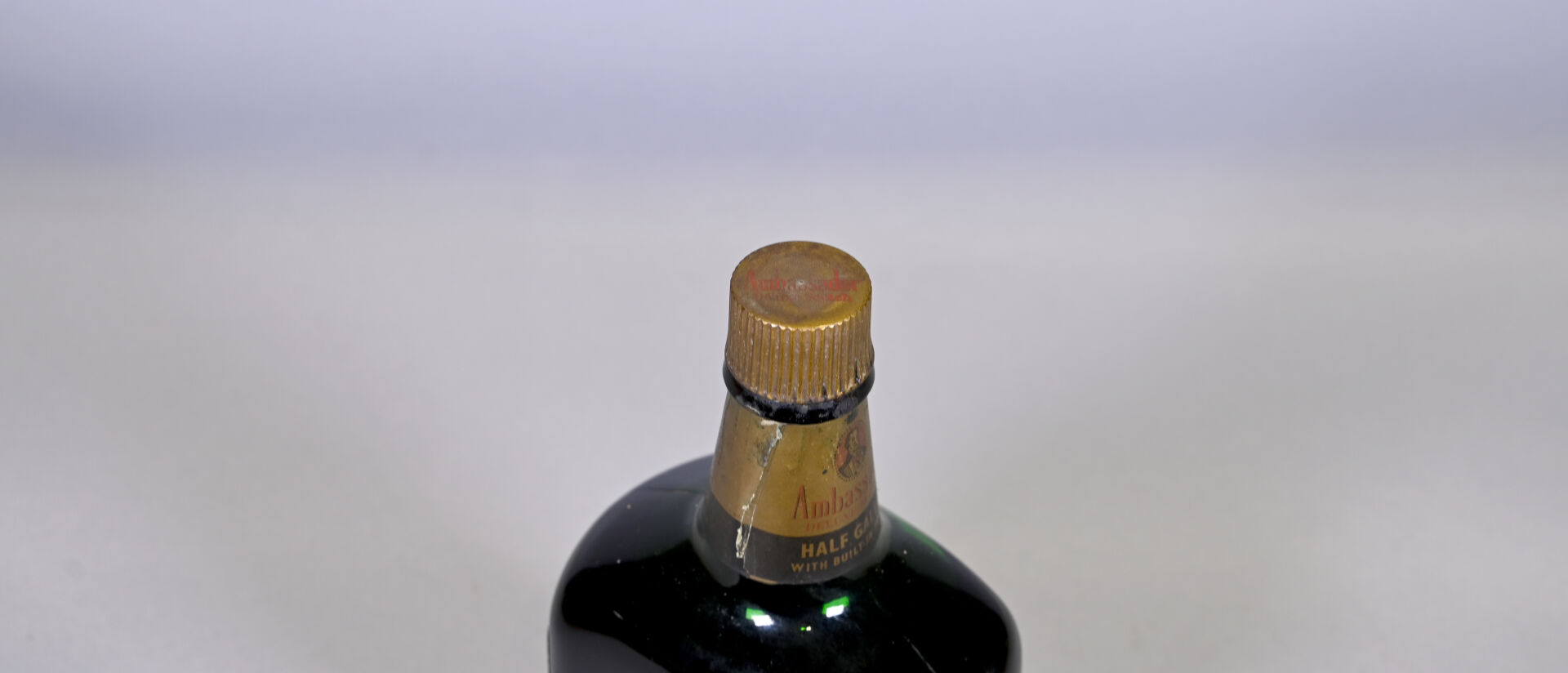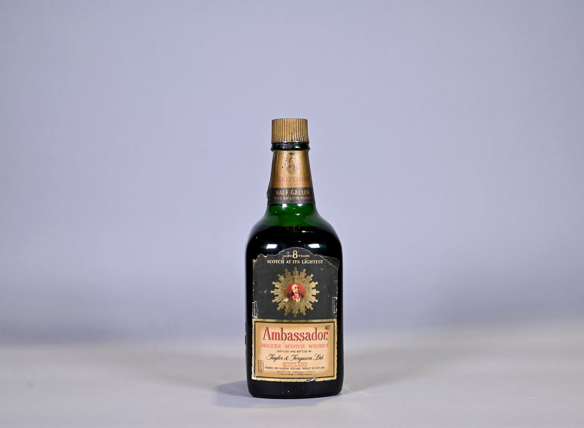 WHISKY – 1 half-gallon (environ 2,27 litres), Whisky (Ecosse), Taylor and Ferguson Limited, Ambassador, Deluxe, 8 ans. Niveau légèrement bas. Capsule légèrement sale. Etiquettes légèrement sales et légèrement abimées.