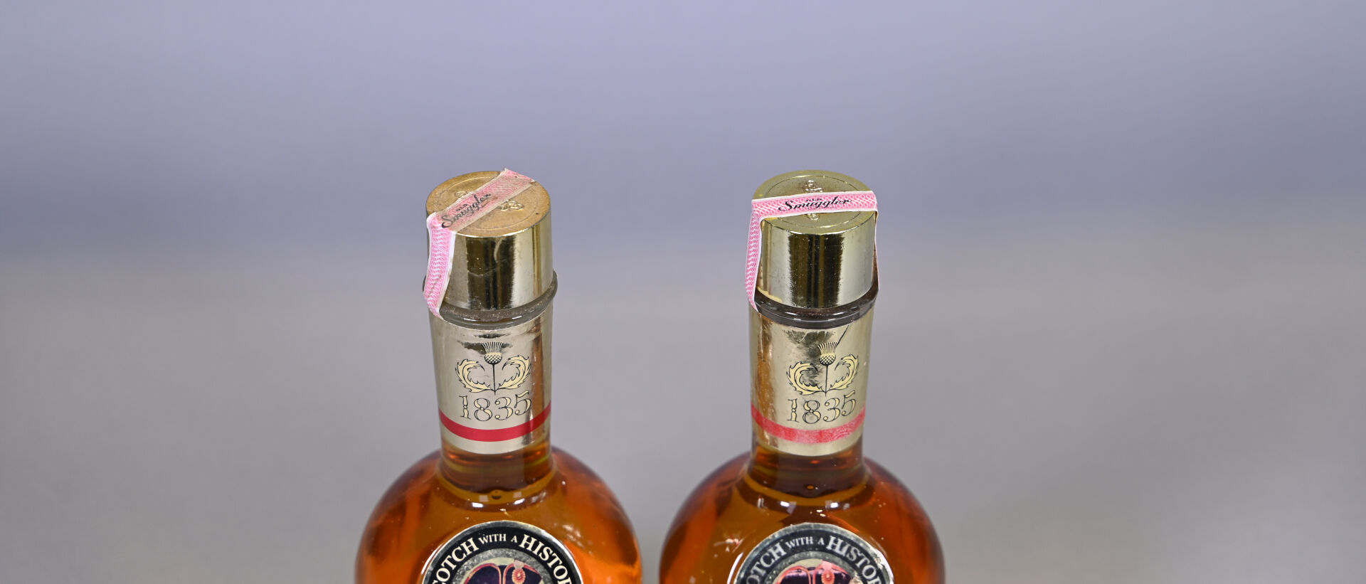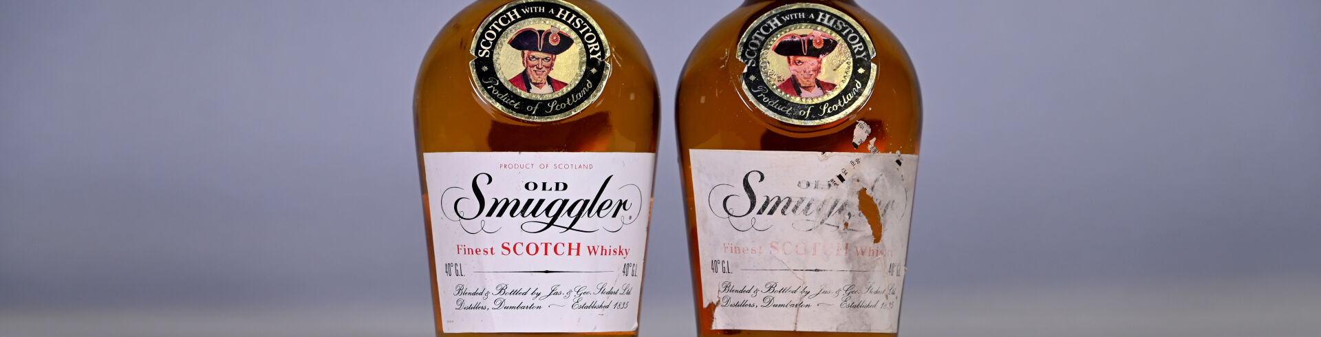 WHISKY – 2 bouteilles, Whisky (Ecosse), Old Smuggler. Capsules légèrement sales, abimées et dont une est défaite. Etiquettes légèrement sales à sales dont une est abimée. Une contre-étiquette est presque entièrement manquante.