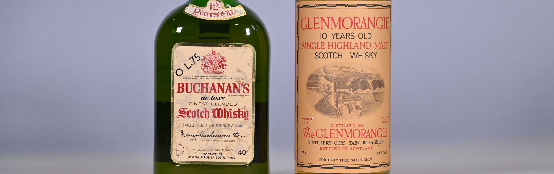 1 bouteille, Whisky (Ecosse), Buchanan’s, de Luxe, Blended. Niveau très légèrement bas. Collerette et étiquette légèrement sales.