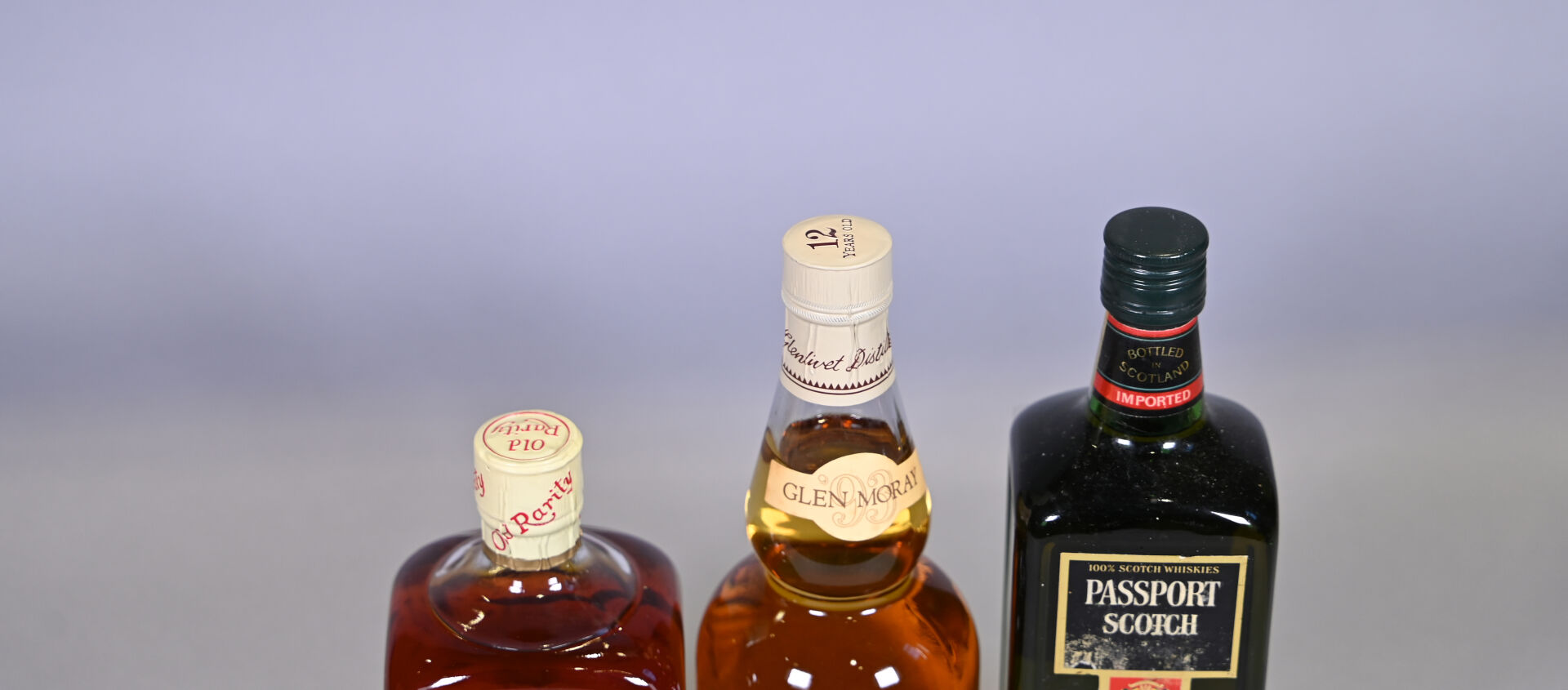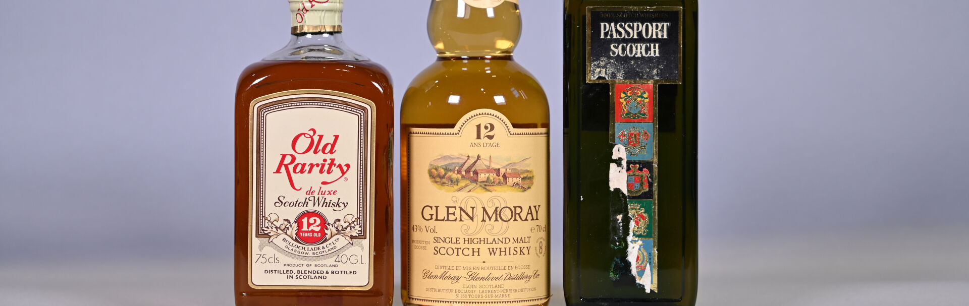 1 bouteille, Whisky (Ecosse), Passport Scotch. En étui d’origine (légèrement sale et abimé). Collerette légèrement défaite. Etiquette dégradée et légèrement sale. Contre-étiquette partiellement décollée.