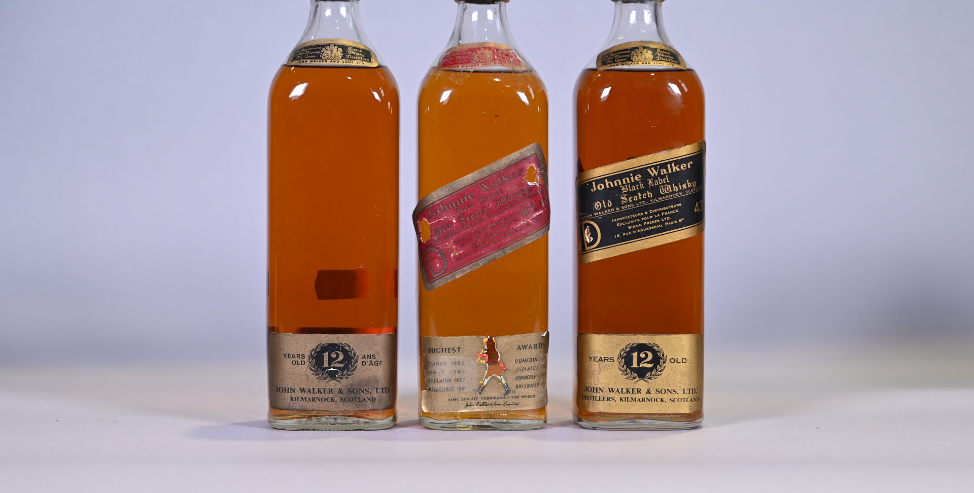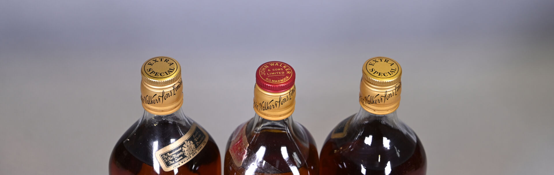 2 bouteilles, Old Scotch Whisky (Ecosse), Johnnie Walker, 12 ans, Extra Special. En étuis individuels d’origine (sales à très sales). Niveaux légèrement bas. Bandeaux et étiquettes légèrement sales et abimées. Une étiquette est manquante.