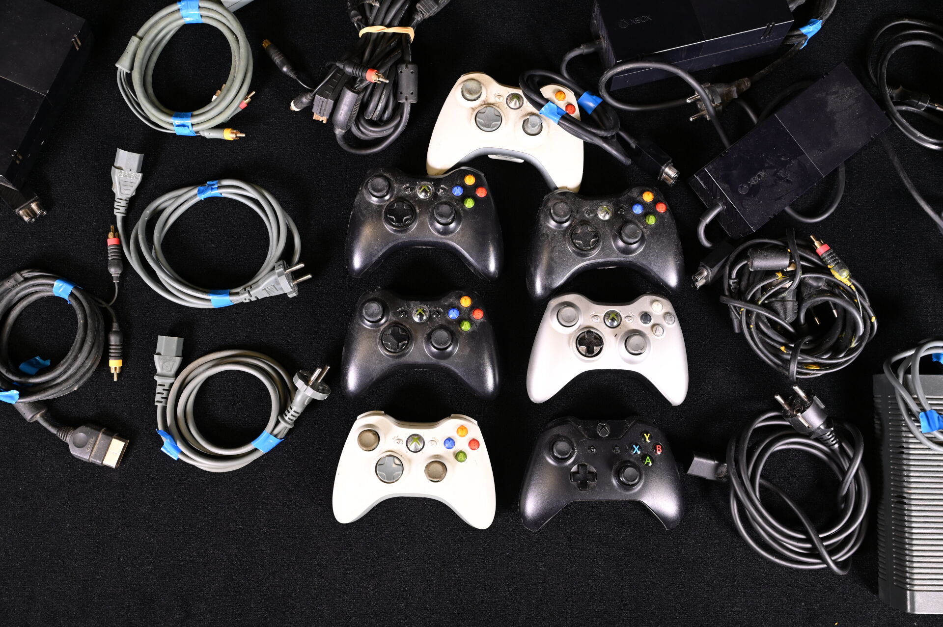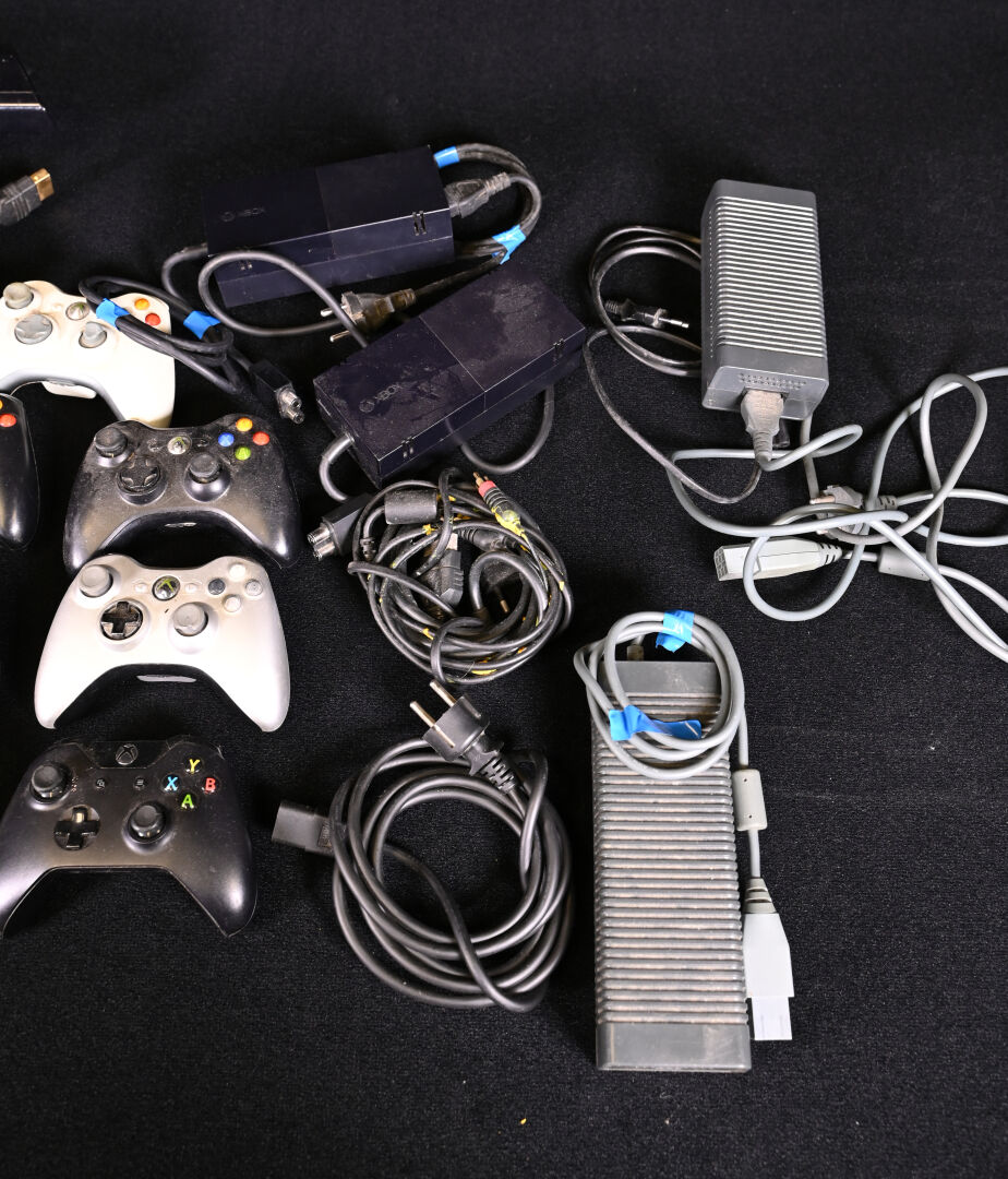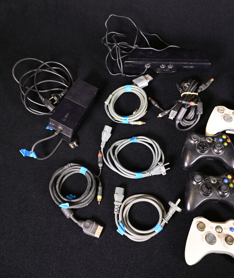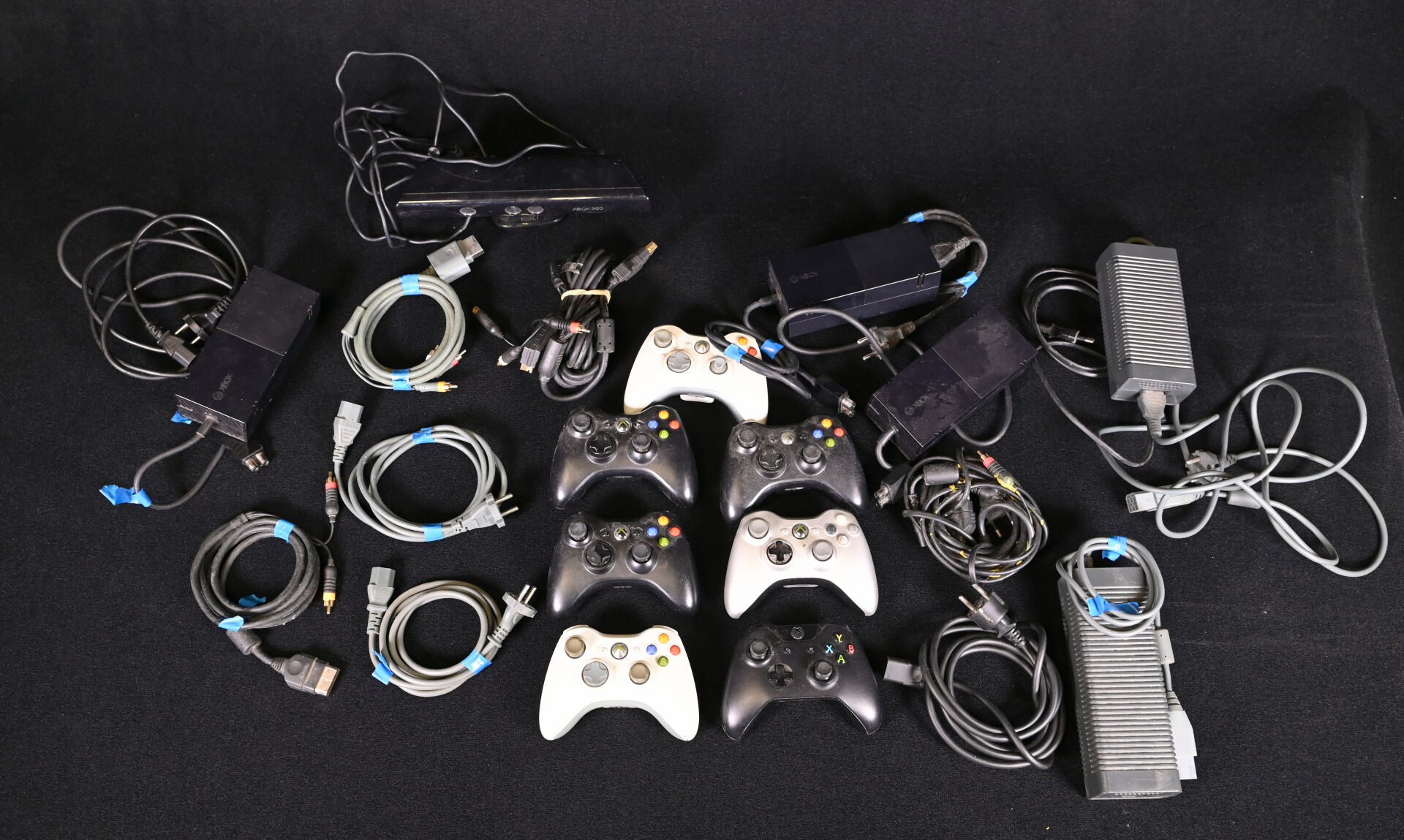 XBOX – 1ere, 2eme et 3eme génération. Ensemble varié comprenant 7 manettes, 1 Kinect et câbles dont alimentation (usures d’usage).