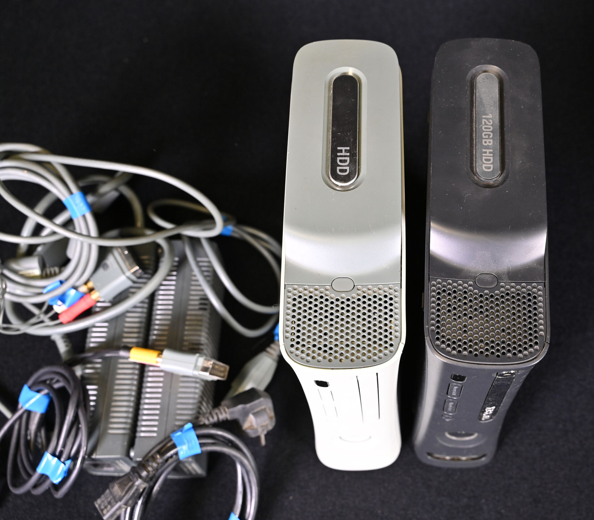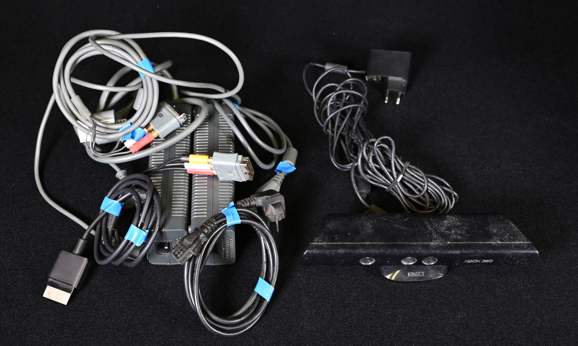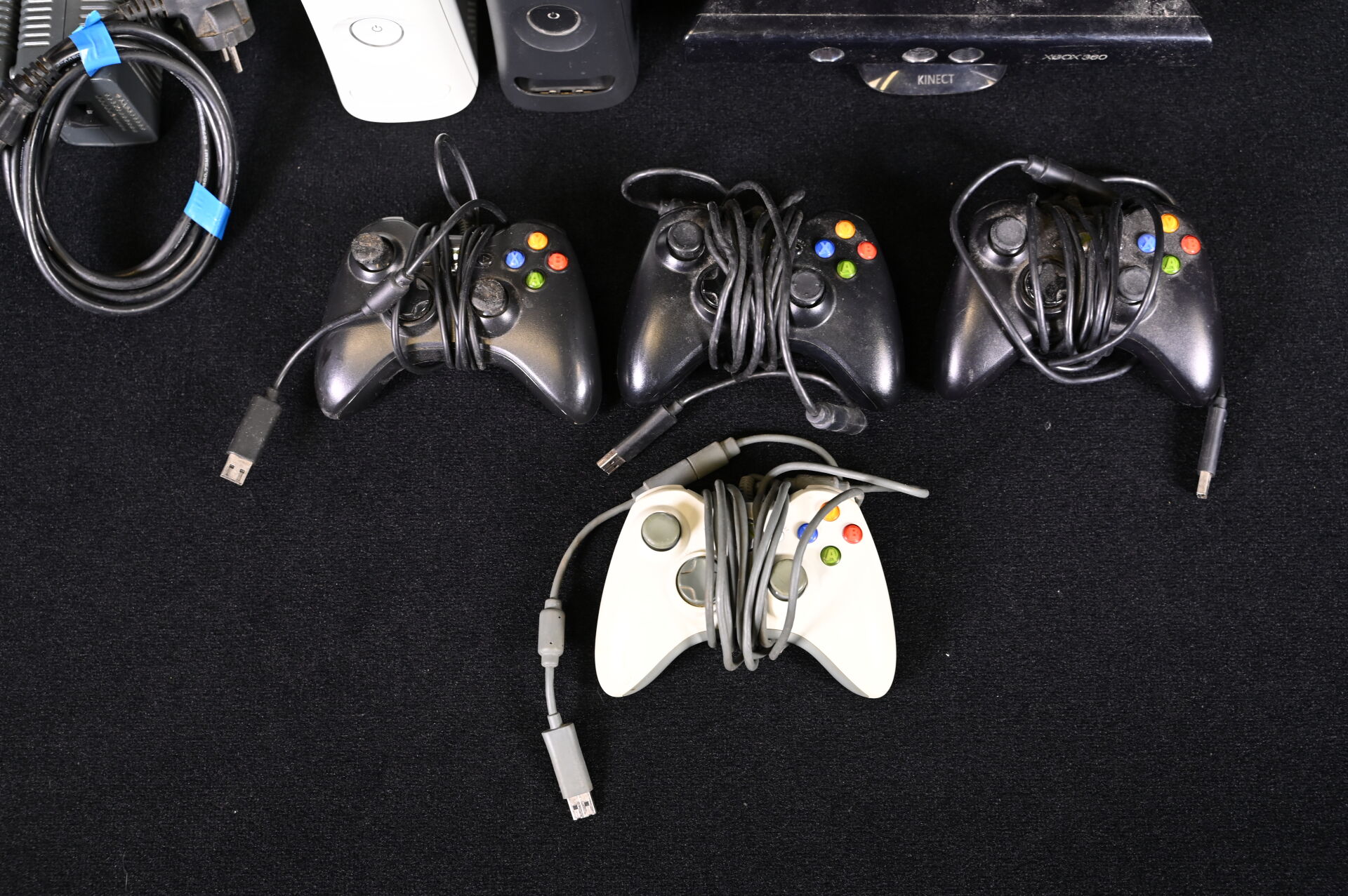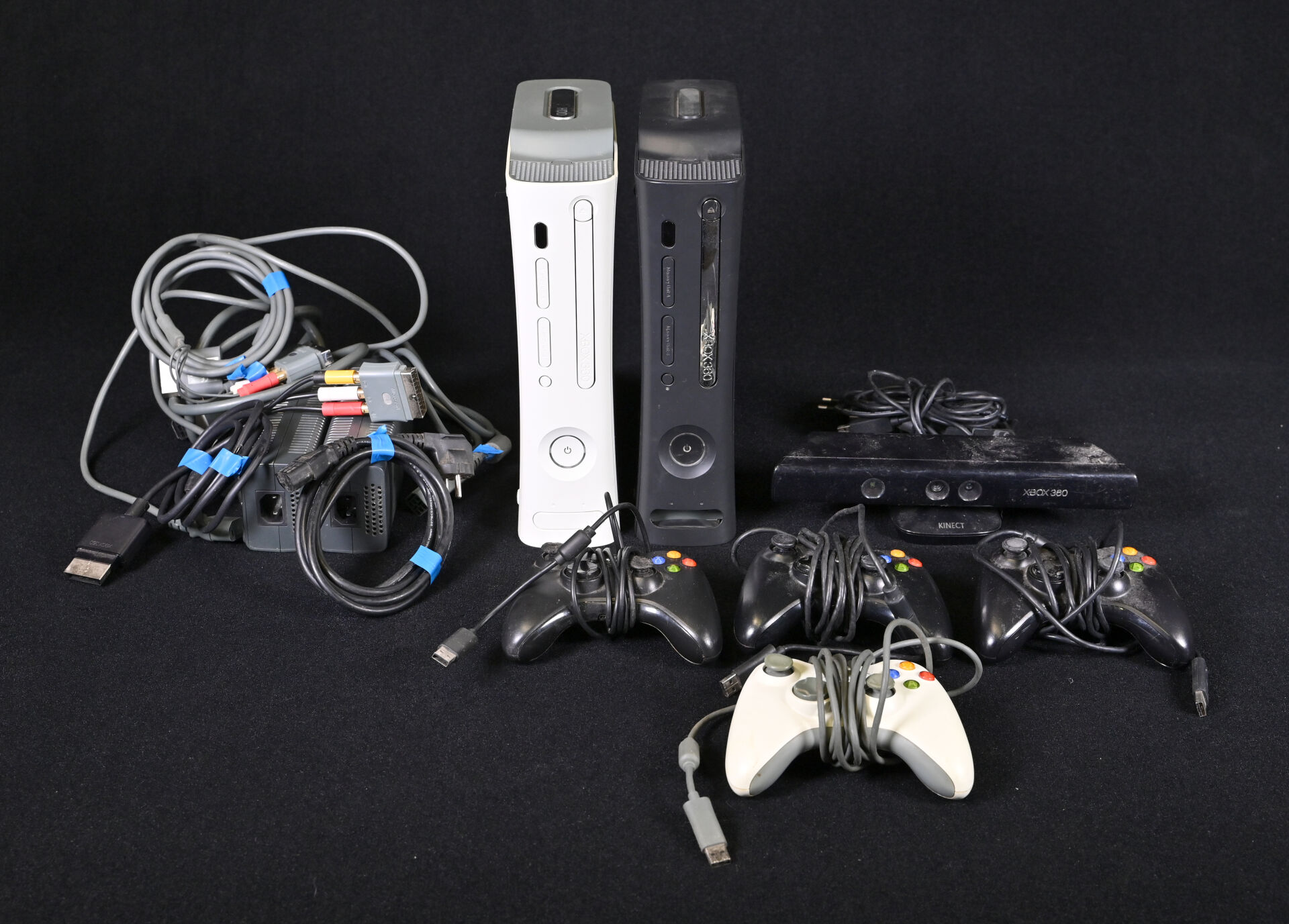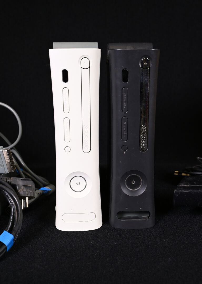 XBOX 360. Deux consoles (blanche et noire), quatre manettes, une Kinect et câbles dont alimentation (usures d’usage).