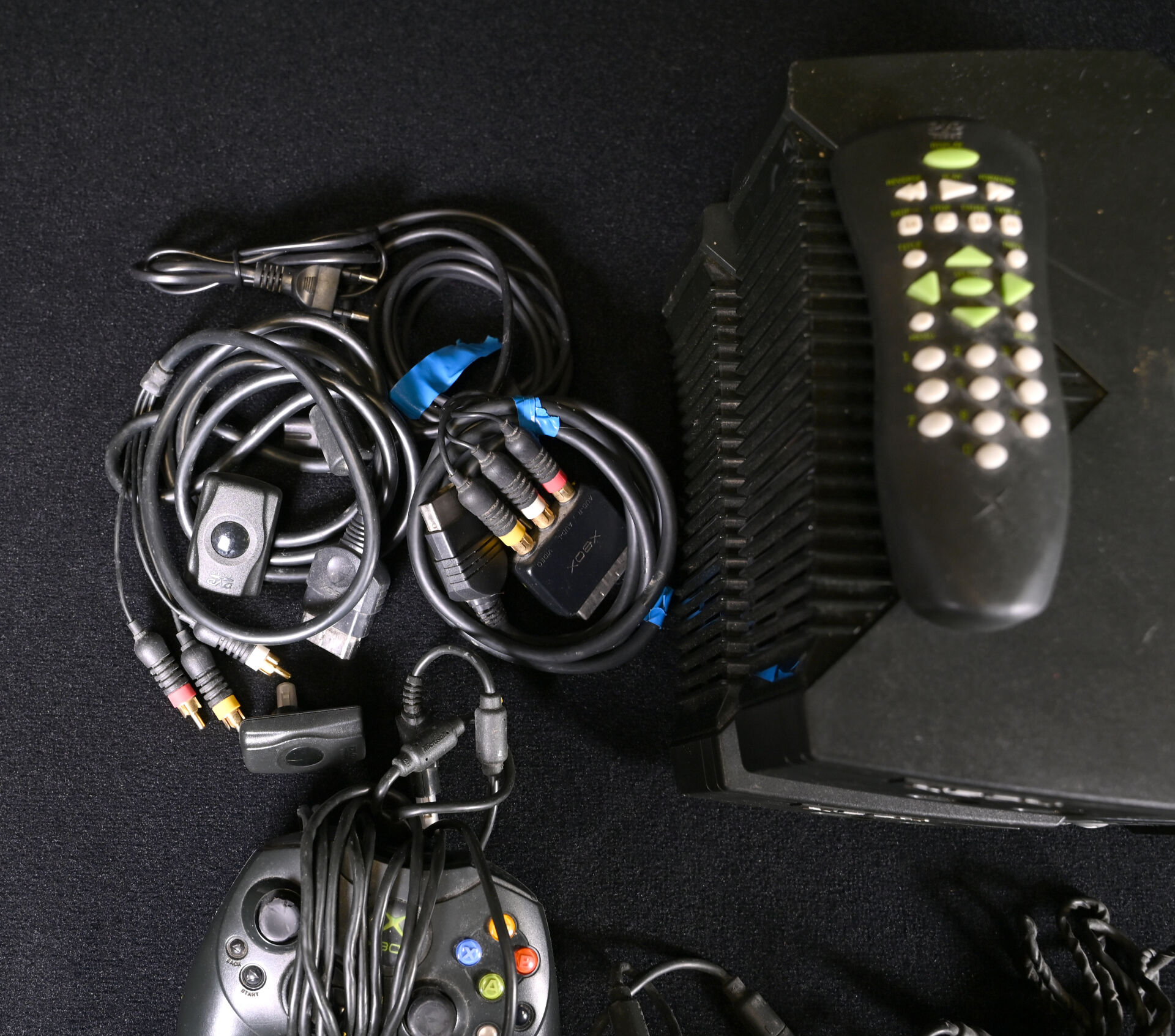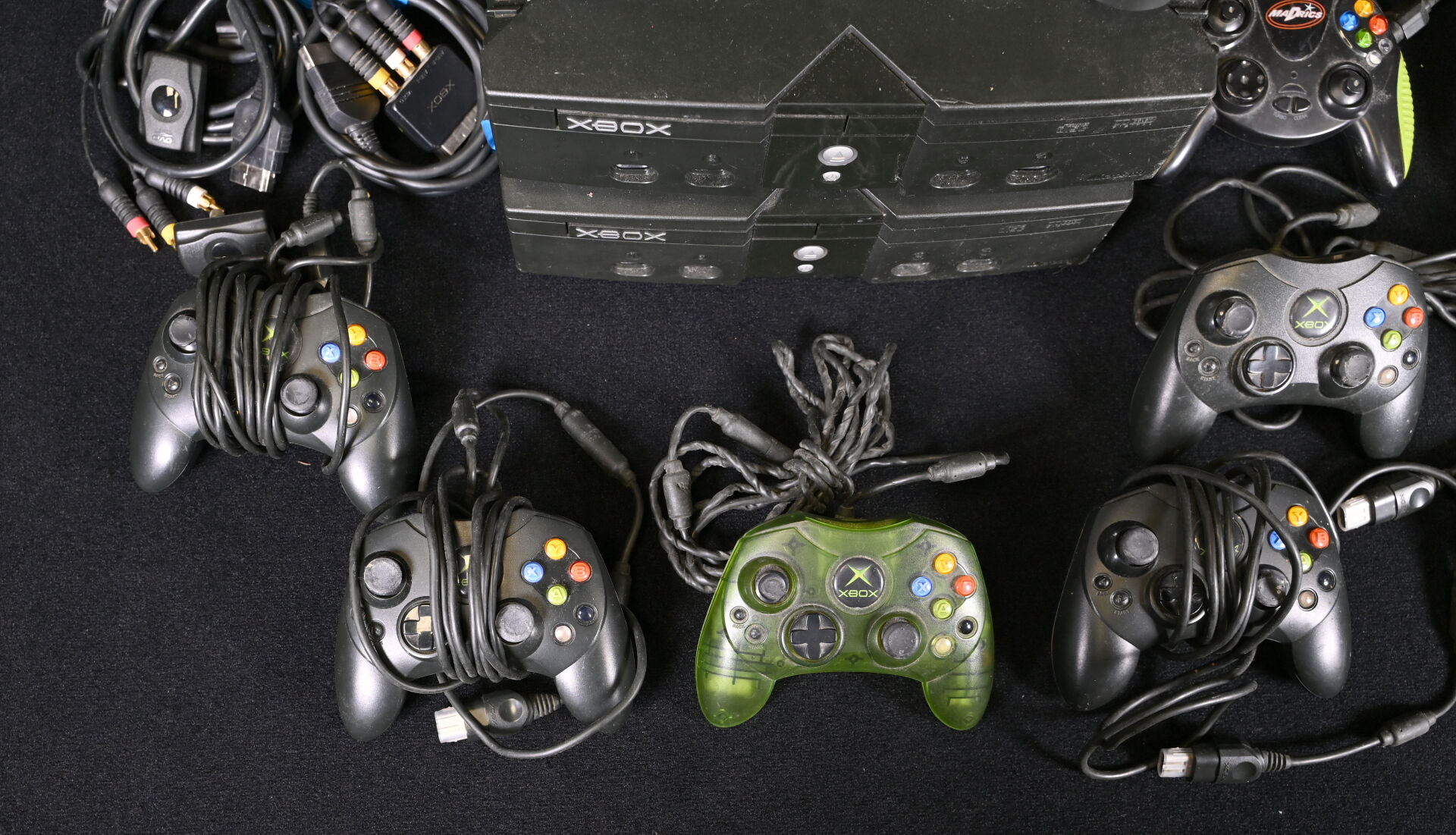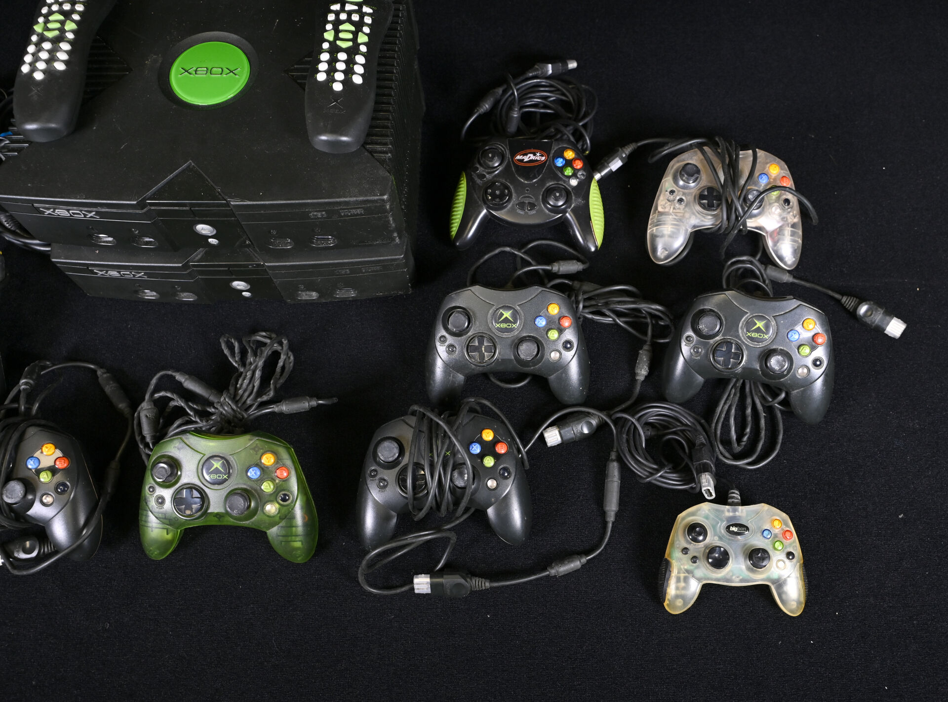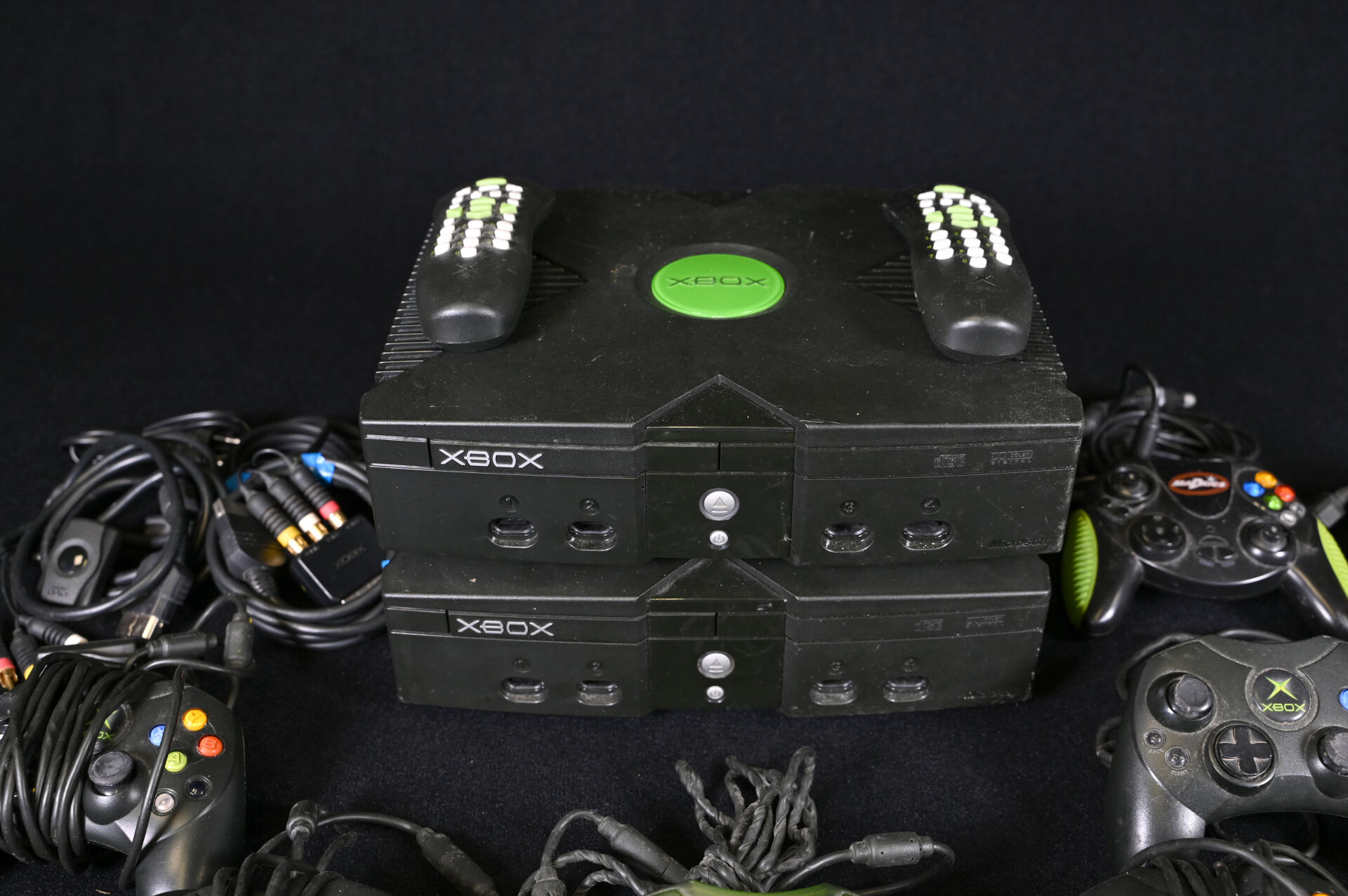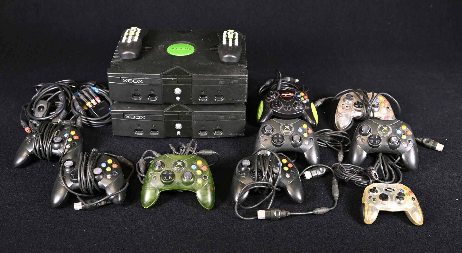 XBOX. Deux consoles, neuf manettes (marque XBOX et autres), deux télécommandes et câbles (usures d’usage).