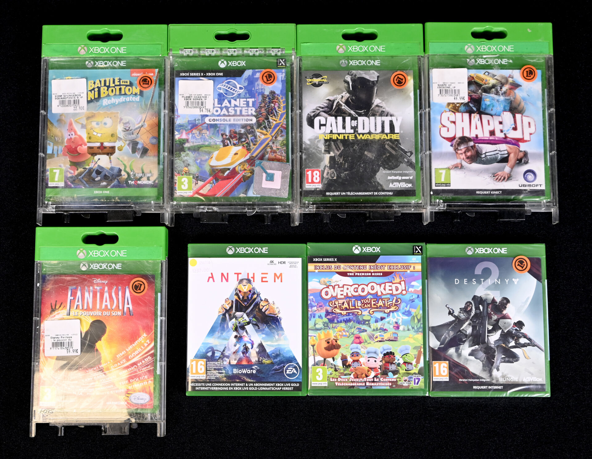 XBOX ONE. Ensemble de 8 jeux dont PLANET COASTER, FANTASIA LE POUVOIR DU SON, DESTINY 2, SHAPE UP et divers, certains sous blister et/ou boîtes scellées.