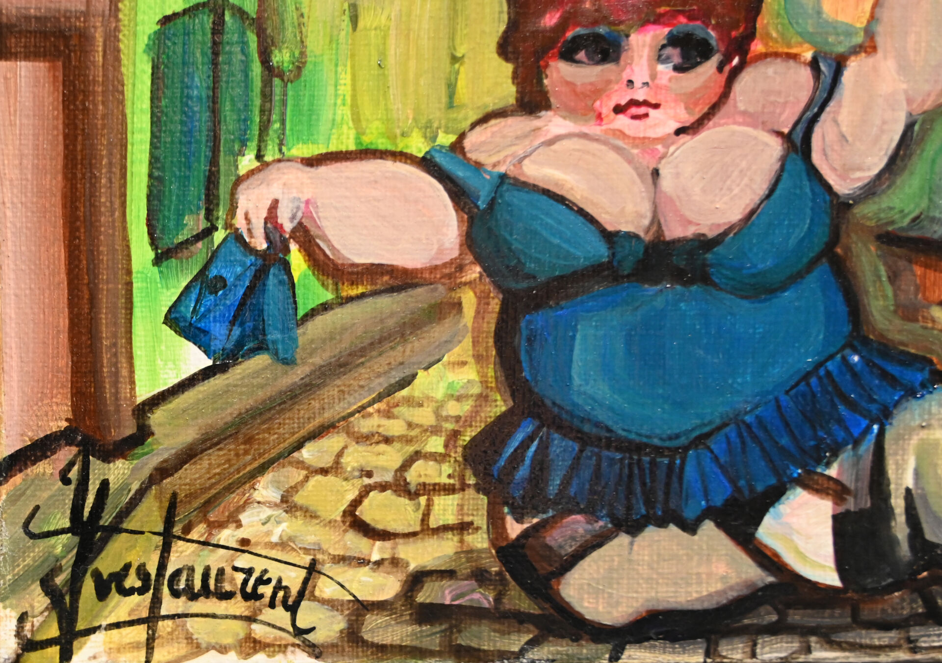 Yves LAURENS (XXe – XXIe siècle). Fille de joie à la bouteille. Huile sur toile. Signée en bas à gauche. 16 x 24 cm.