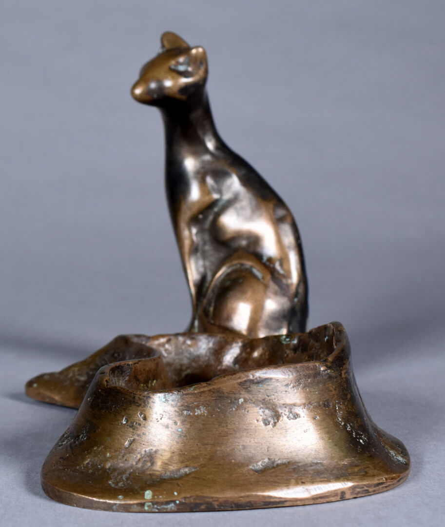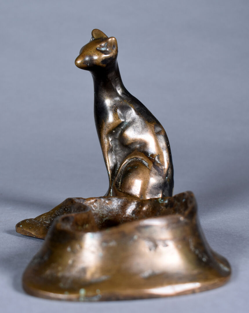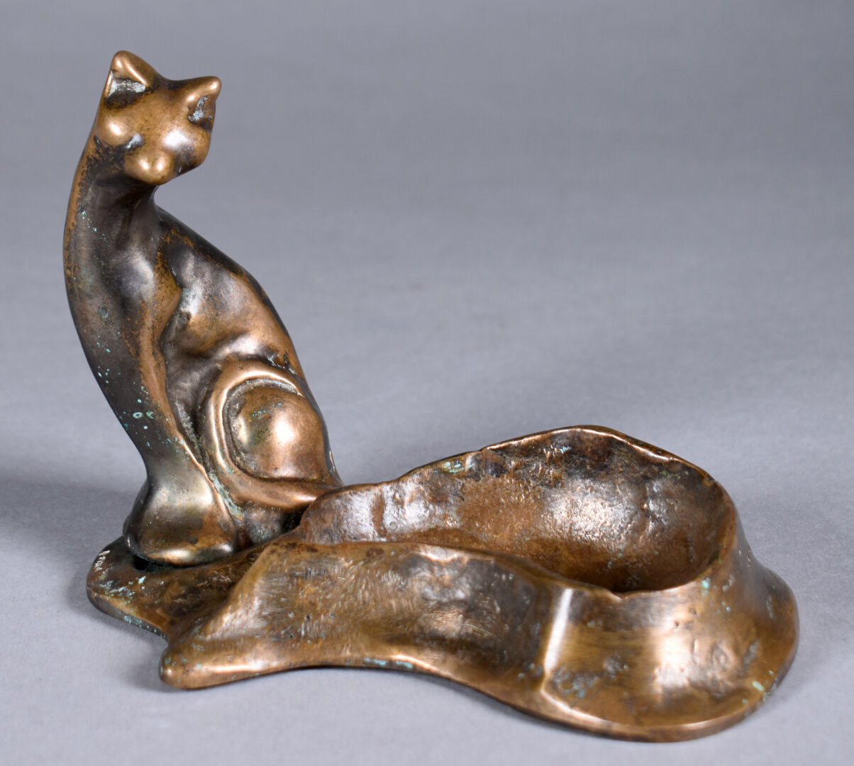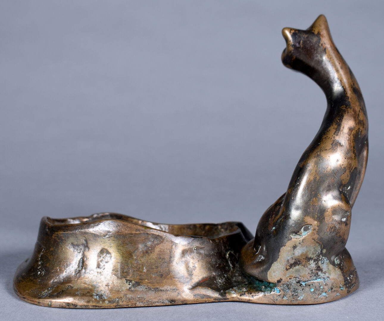 Yves LOHE (Né en 1947). Vide poche en bronze à patine médaille orné d’un chat assis. Signé. Haut. : 14 cm.