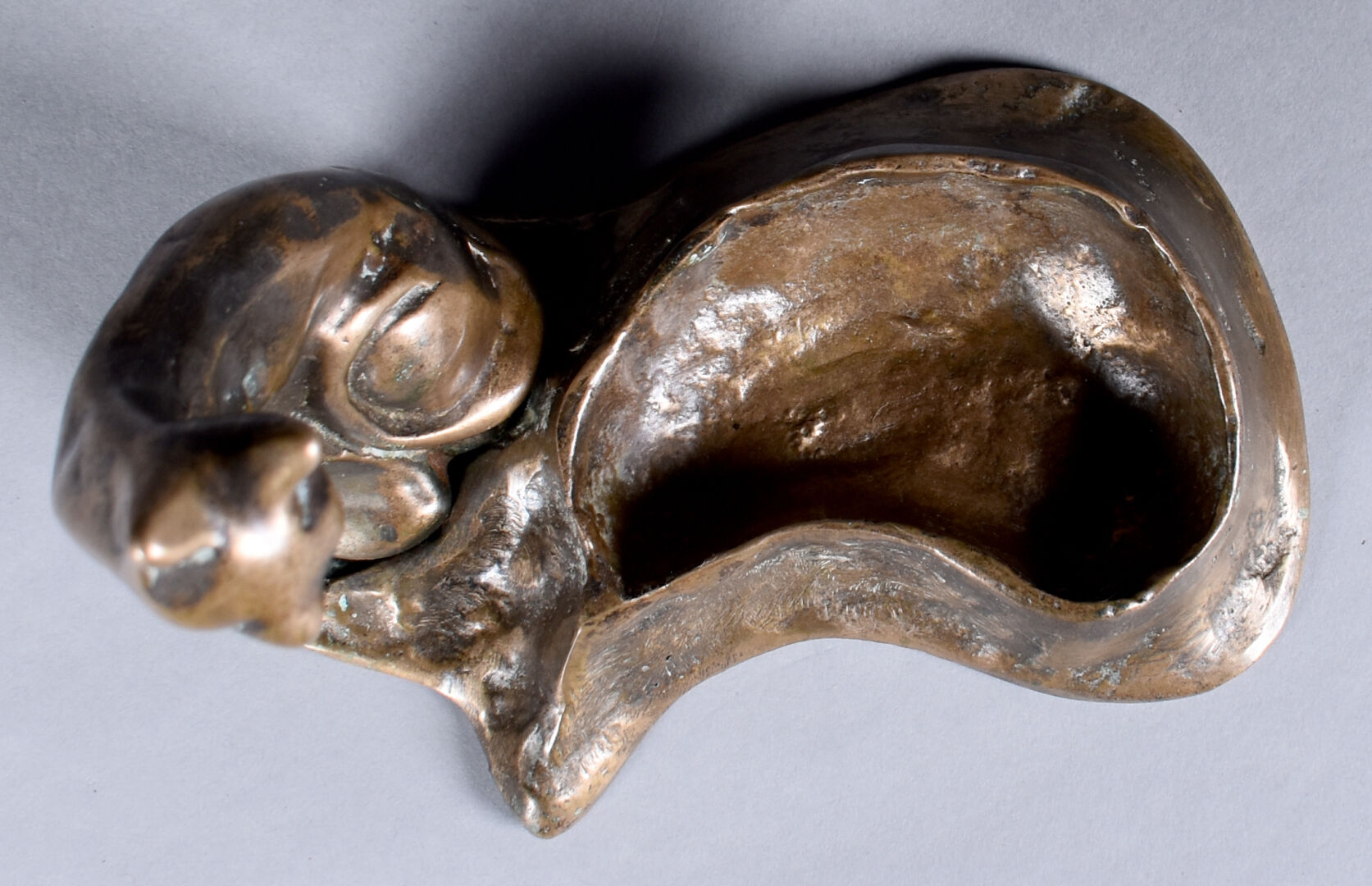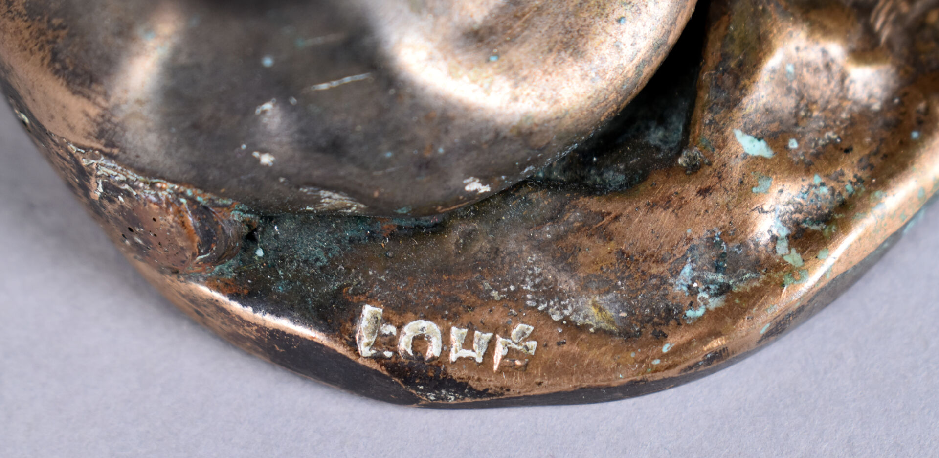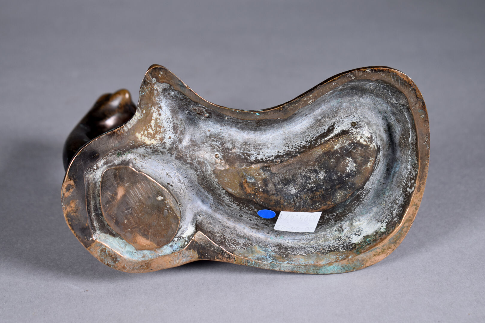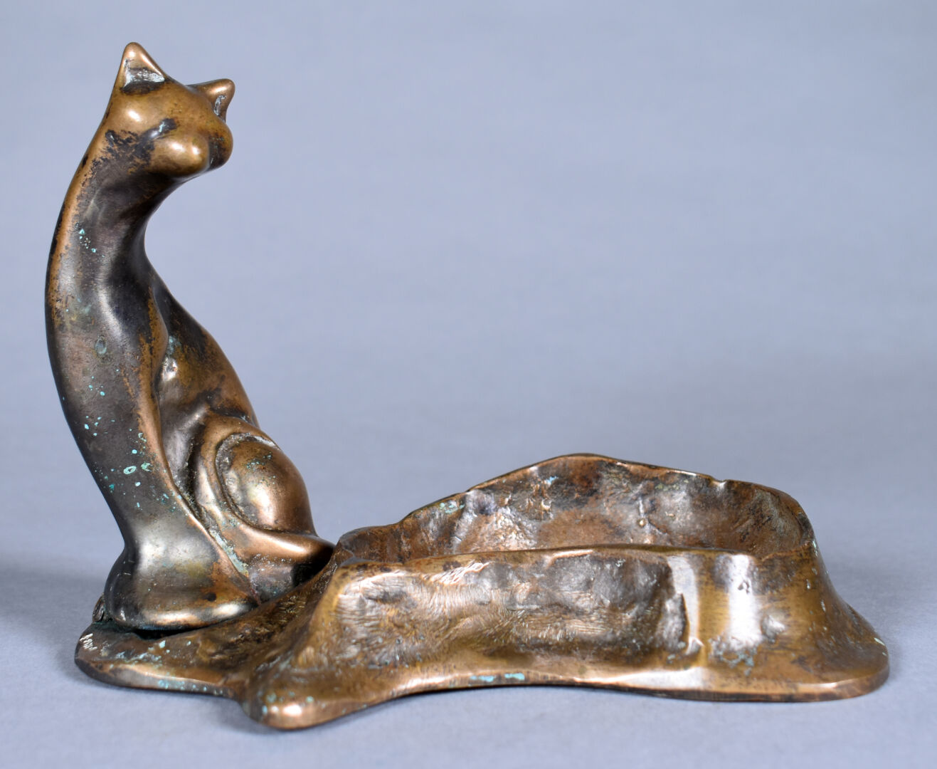 Yves LOHE (Né en 1947). Vide poche en bronze à patine médaille orné d’un chat assis. Signé. Haut. : 14 cm.