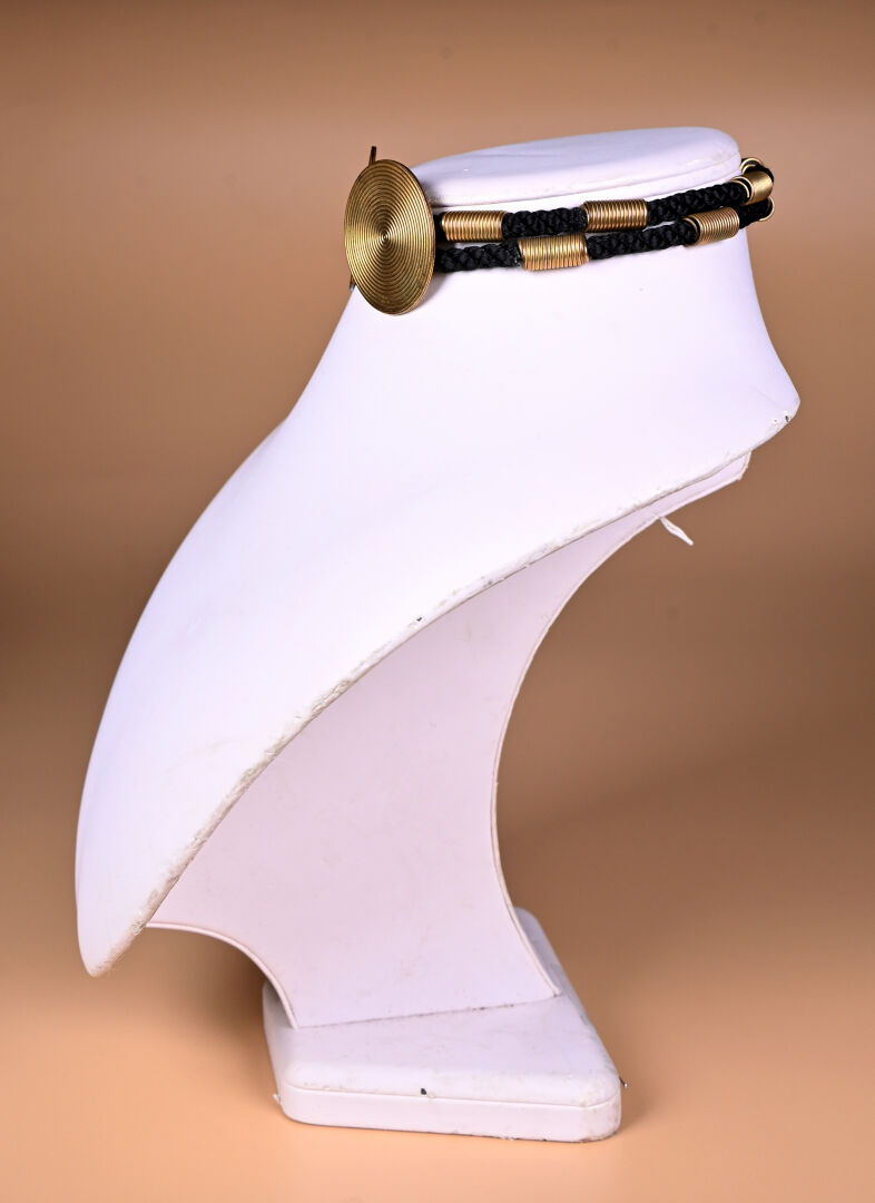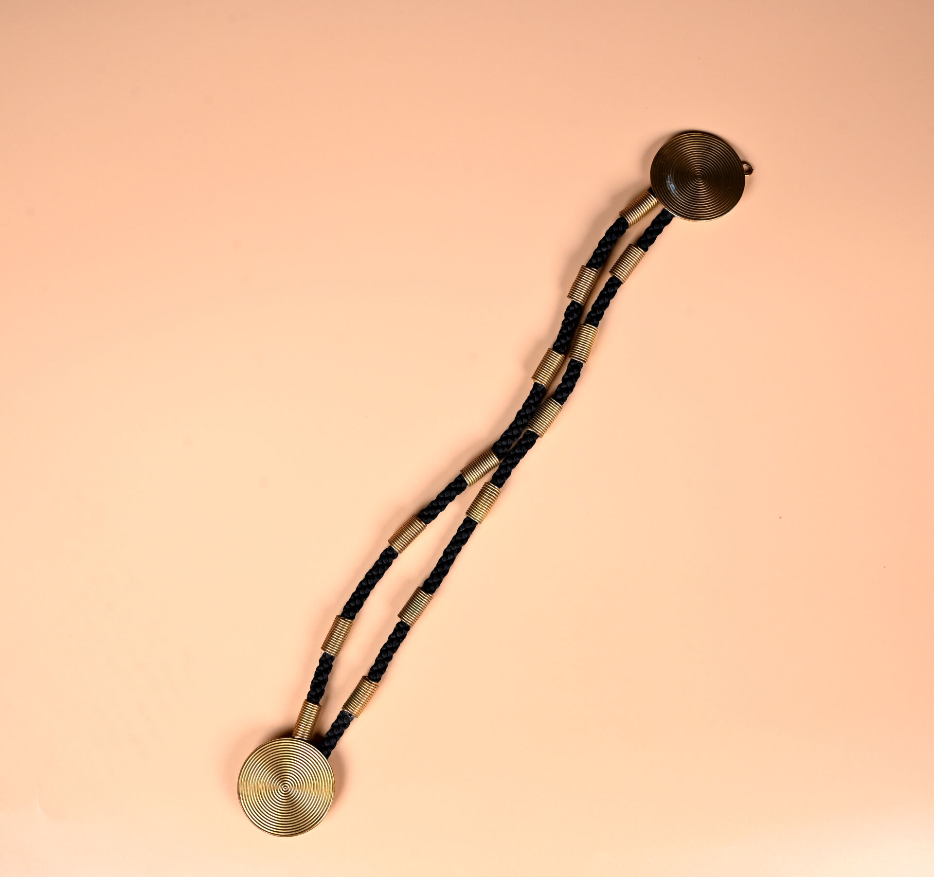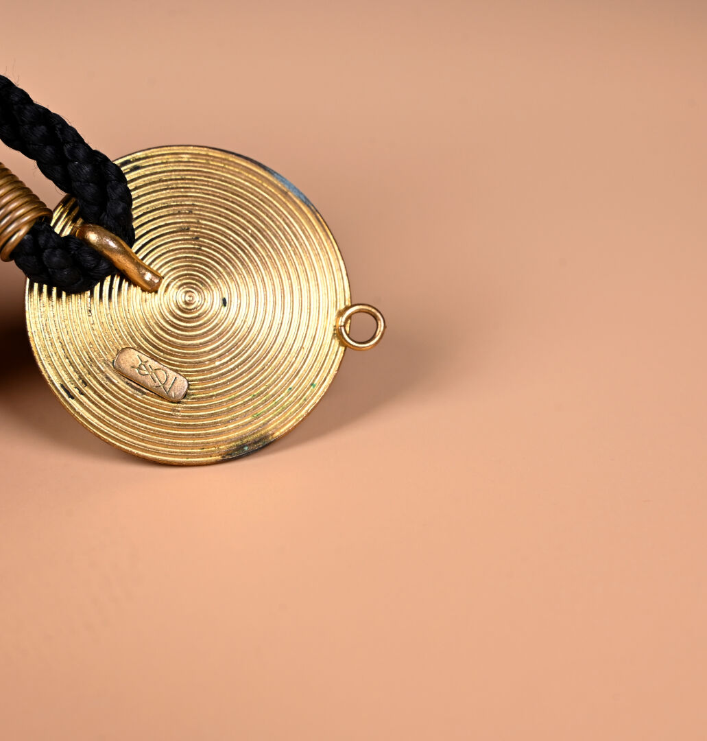 YVES SAINT LAURENT. Collier ras du cou en métal doré et cordage noir tressé à motif de deux disques. Long. : 34 cm. Petites oxydations.