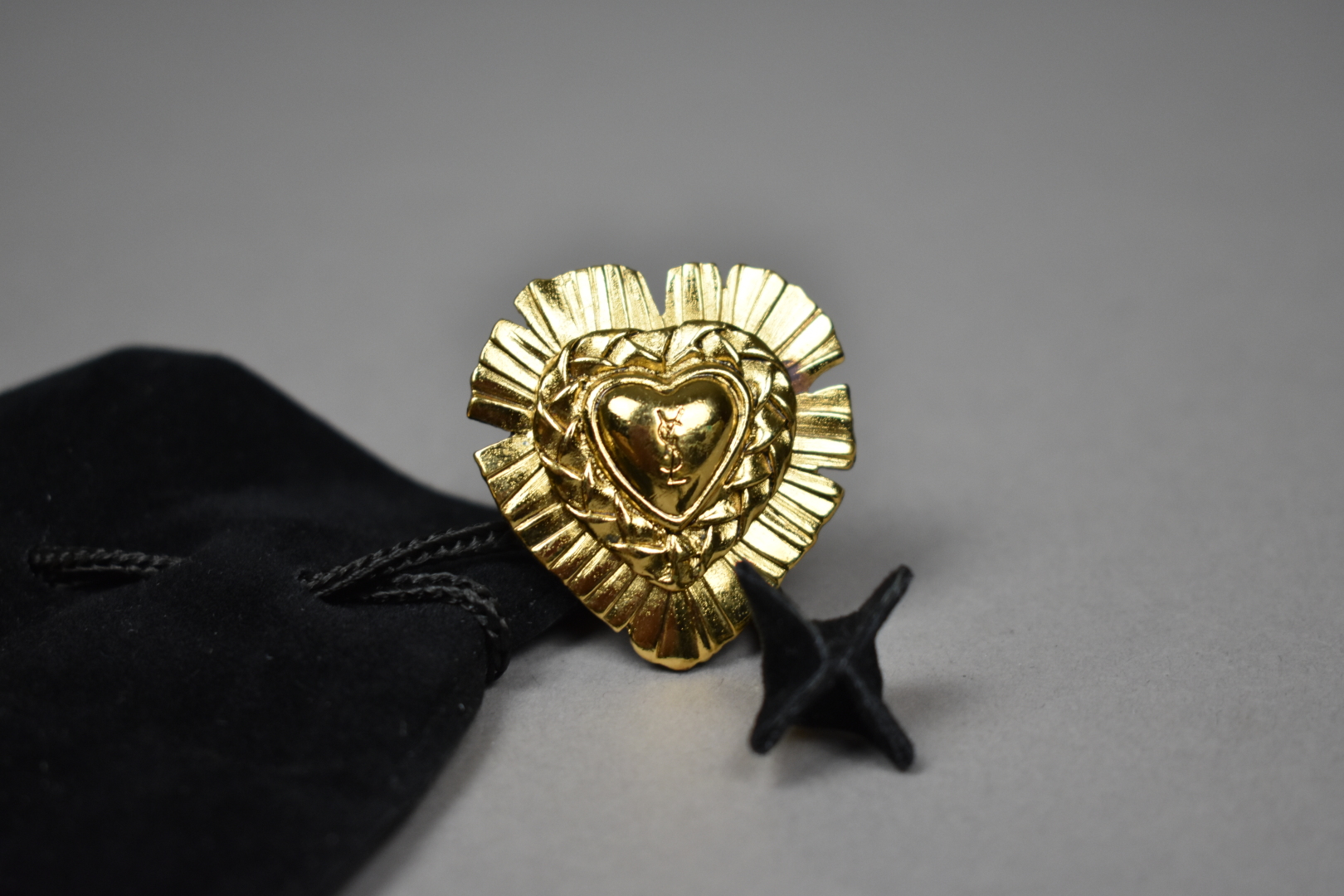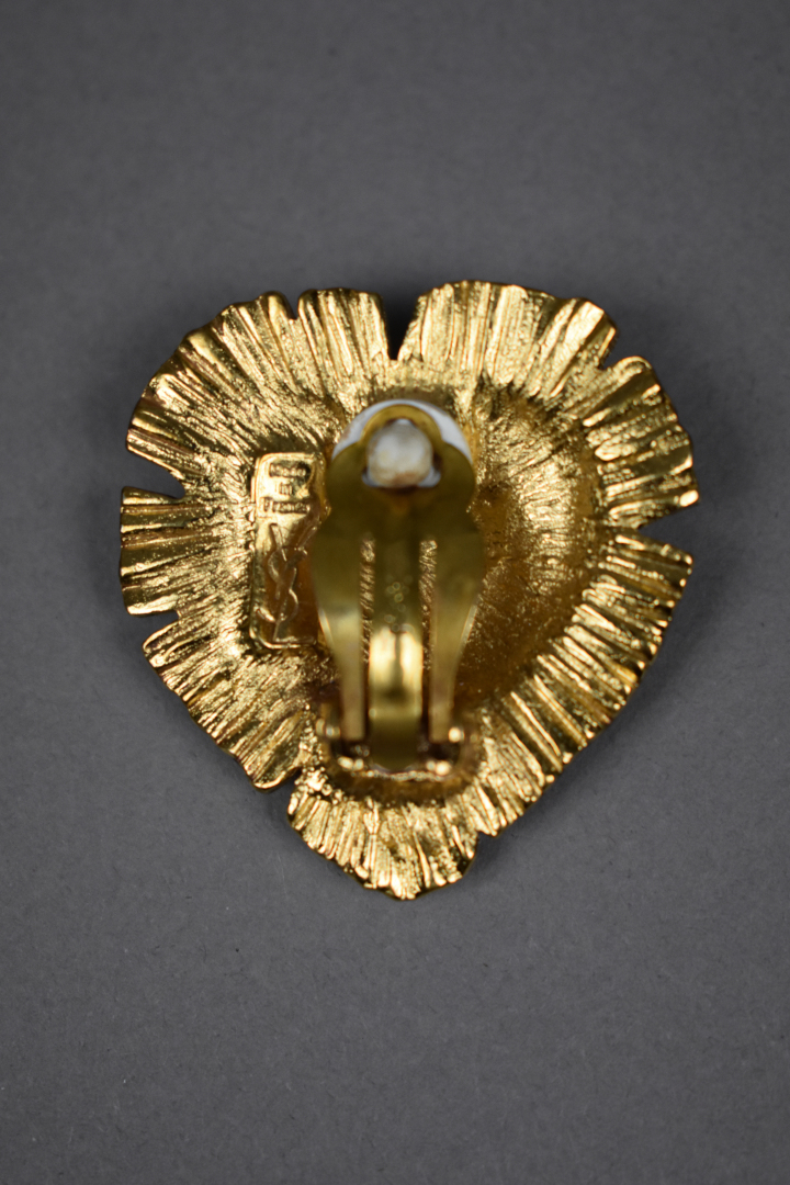 YVES SAINT LAURENT. Paire de clips d’oreille en métal doré en forme de coeur rayonnant. Pochon.
