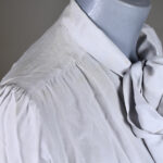 YVES SAINT-LAURENT Rive gauche. Deux chemisiers en soie, le col à lavallière , un rose poudré et l’autre bleu ciel (petit accro sur le bleu, taches et piqures sur les deux). Taille 42.