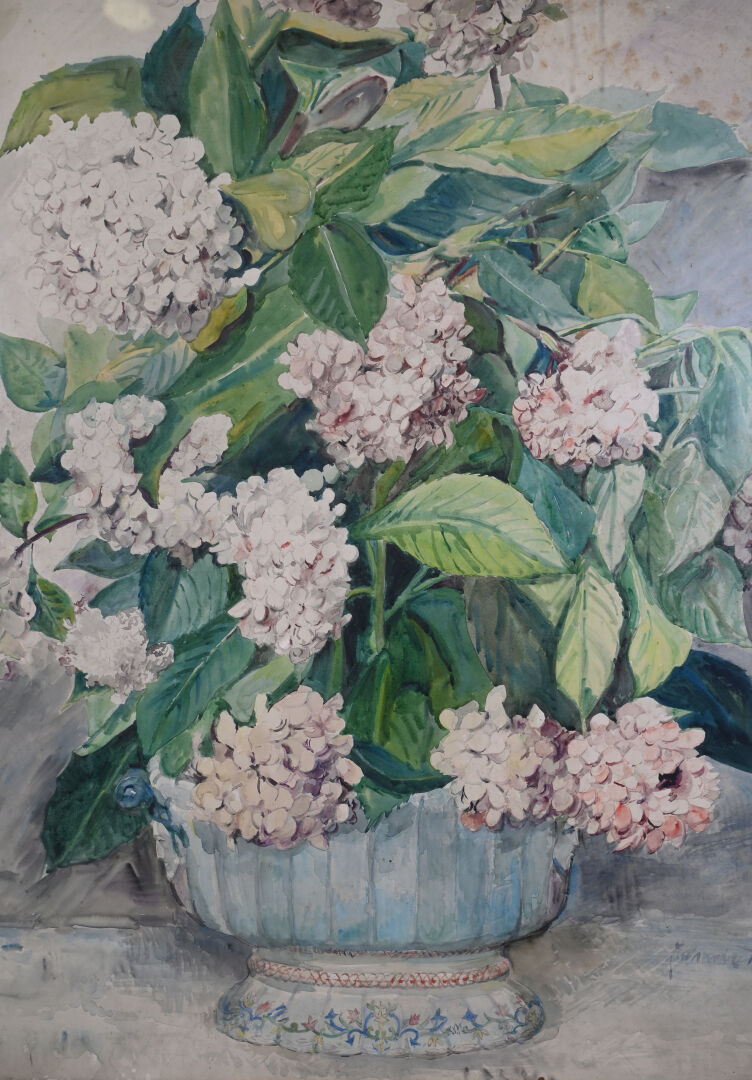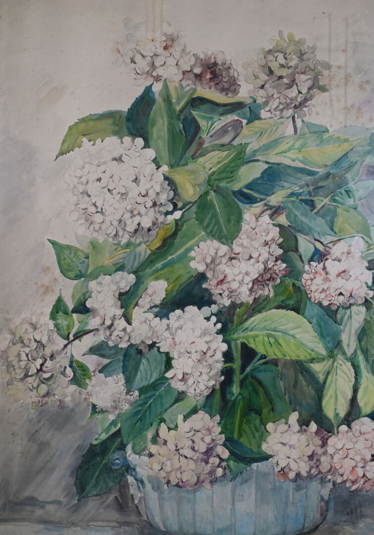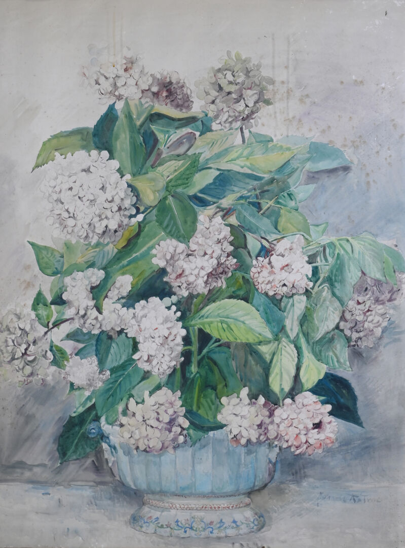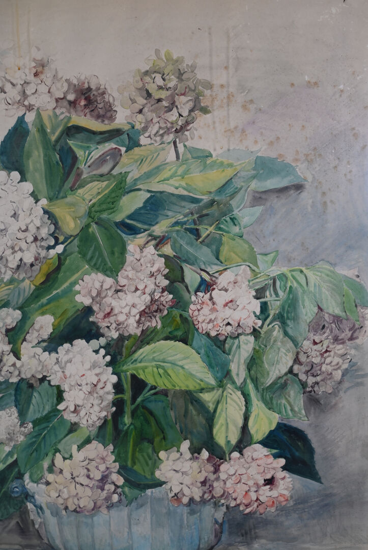Zacharie ASTRUC (1835-1907) Hortensias. Aquarelle signée en bas à droite (piqures, rousseurs, mouillures). 99 x 75 cm.